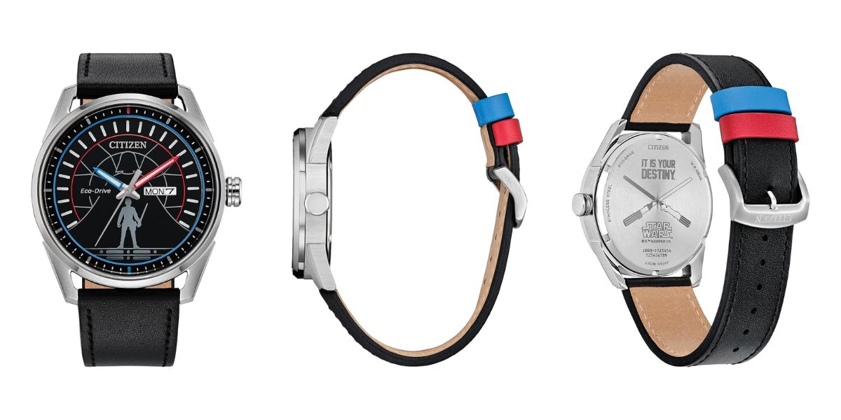 The Citizen Star Wars Duel watch has a black dial, with silver colored outlines of Luke Skywalker and Darth Vader, who famously duelled on Cloud City in the movie The Empire Strikes Back. There are red and blue accents throughout, including the lume-filled fans and the watch strap loops; these are the colors of the lightsabers used in the fight. The dial is surrounded by a brushed stainless steel casing, measuring 42 mm (~1.65 inches) across, with the steel case back engraved with the text “It is your destiny” and two lightsabers.