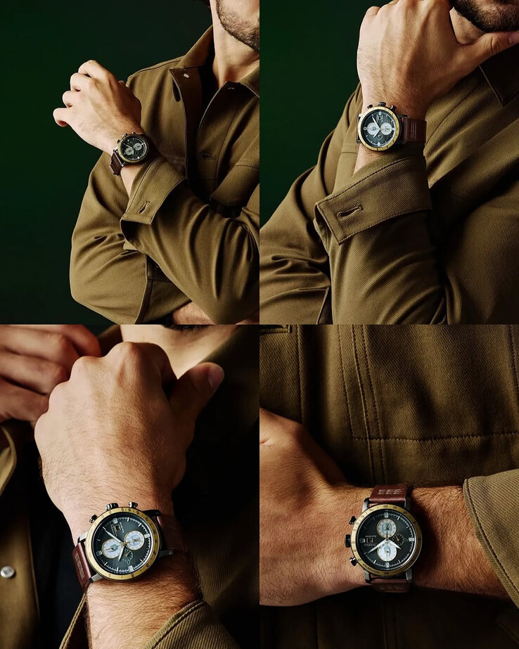 The watch uses a 43.6 mm stainless-steel case finished in a dark tone, with a brown leather strap that has visible stitching near the lugs. The overall look is closer to a pilot-style chronograph, but with multiple references to the series integrated into the dial. At first glance, the dial appears to be a gray sunburst surface, but a closer look reveals themed sub-dials. The upper sub-dial uses the Mudhorn symbol, which references the creature Din Djarin defeats in the show, while the lower register displays Mandalorian helmet artwork. Small, stylized Grogu ears are also incorporated into the design. These details fit seamlessly on the chronograph layout rather than being loud.