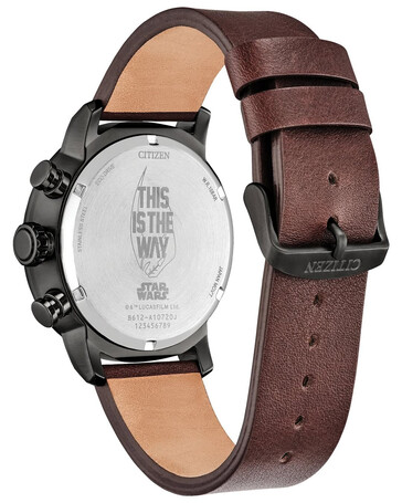 A gold-tone tachymeter bezel surrounds the dial, which also adds contrast to the otherwise dark case. The watch also uses luminous hands and markers, visible in promo images with the glow pattern in low light. Inside, the model runs on Citizen’s B612 Eco-Drive chronograph movement, which is powered by light. The movement supports standard chronograph timing functions and includes a date display positioned at 3 o’clock. The caseback is also engraved with the phrase "This Is The Way", one of the most iconic lines associated with The Mandalorian culture in the Star Wars universe. Additional Mudhorn imagery also shows up alongside the engraving.