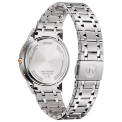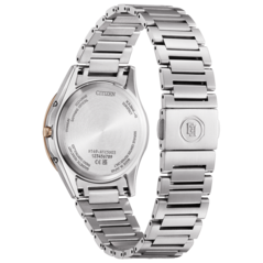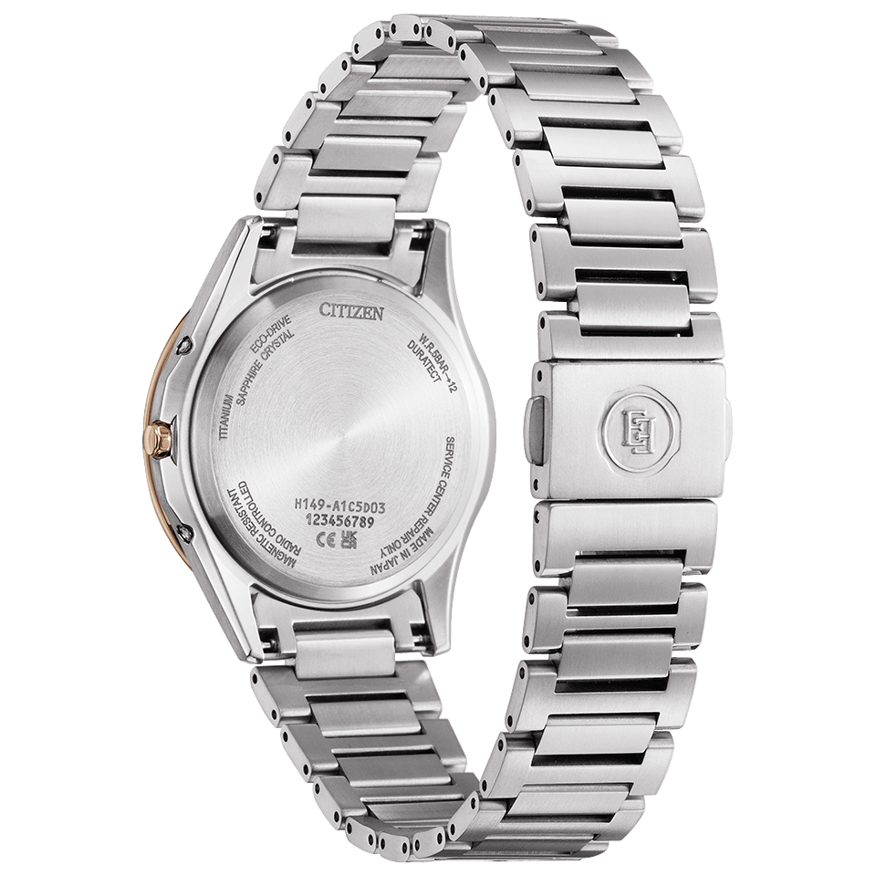 The ES9375-51B is the smaller of the trio at 26.6 mm wide and just 7.7 mm thick, weighing 34 grams. It runs on Caliber H060 and supports radio reception in Japan, China, the US, and Europe. Accuracy is rated at ±15 seconds per month when not receiving a signal. The case and bracelet use Super Titanium with Duratect Platinum and Duratect Sakura Pink surface treatments - this gives the bezel a subtle cherry tone that complements the light silver body quite well. Sapphire crystal with clarity coating sits on top, and water resistance is rated at 5 bar. Pricing is set at ¥132,000 (~$846).