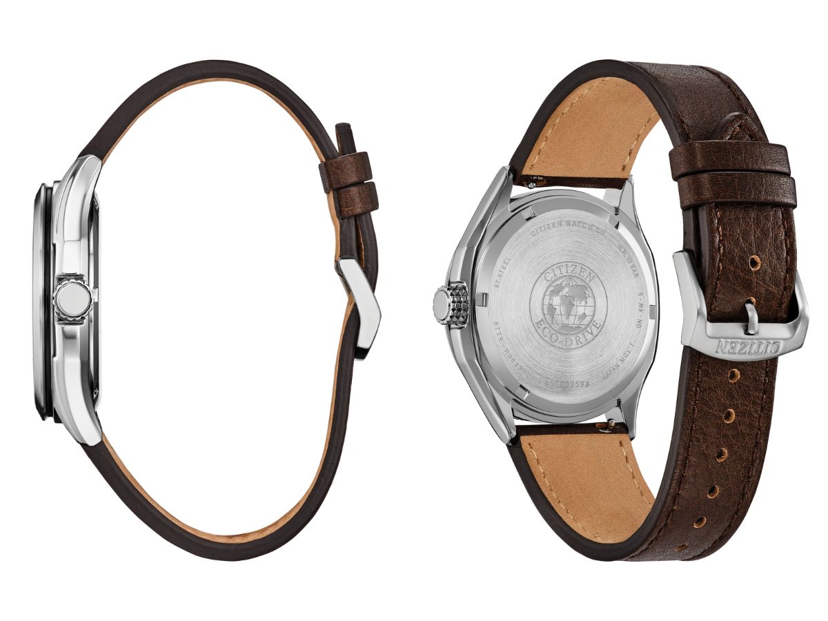 The Citizen AW1890-19B has a textured white face featuring gray accents, while the AW1890-51X has a textured green dial with white indexes. Both versions have a silver colored stainless steel casing, measuring 41.2 mm (~1.62 inches) across. However, the AW1890-51X has a matching metal band, but the AW1890-19B comes with a dark brown leather strap.