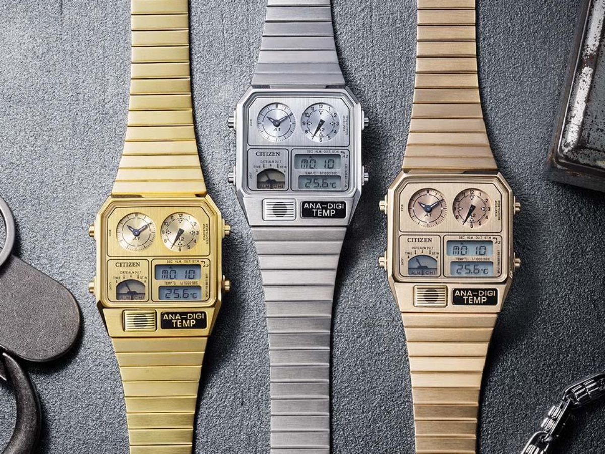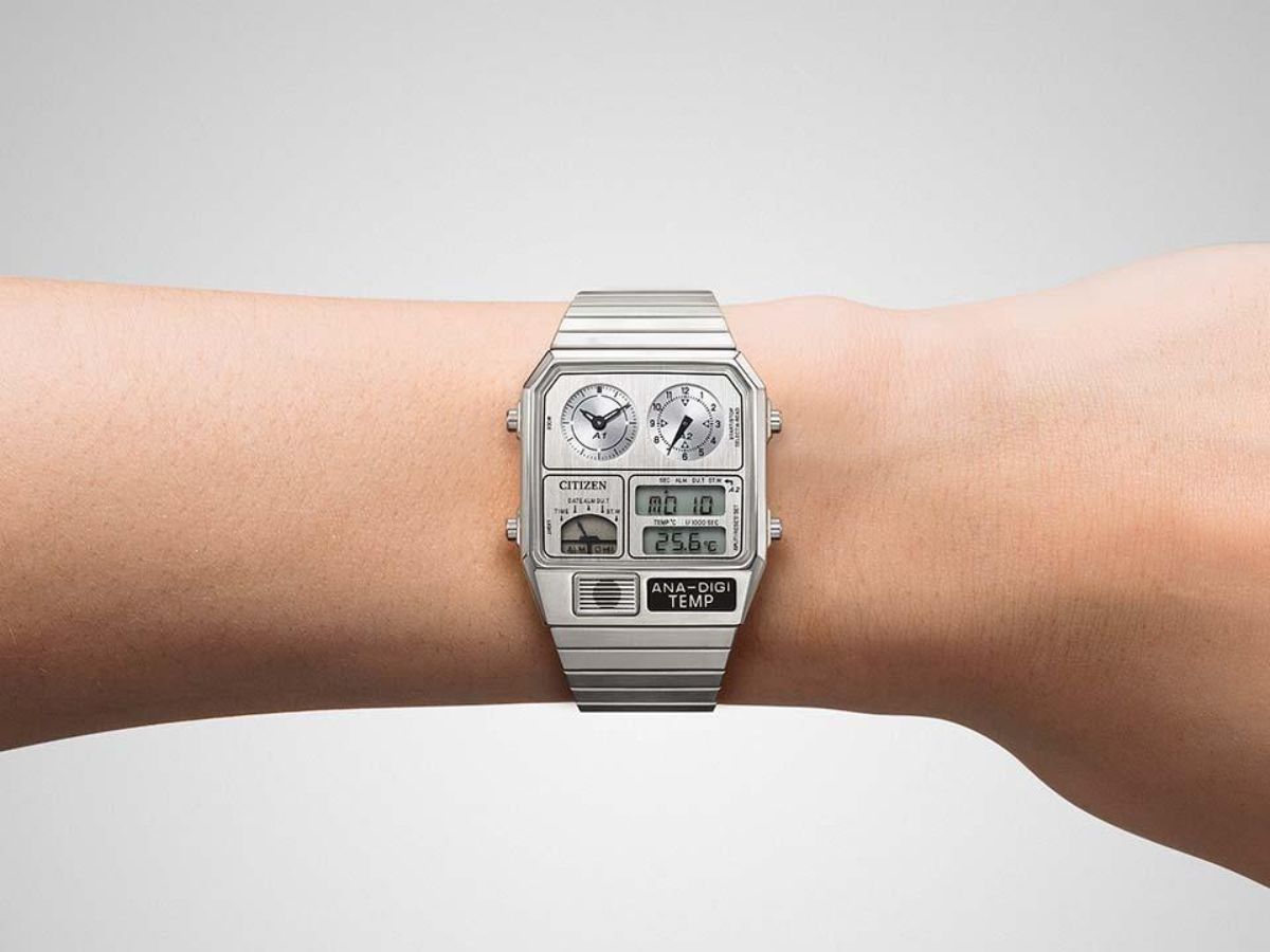 The Citizen Ana-Digi Temp watch launched in the 1980s, with the company suggesting it has a “retro-futuristic design”. The casing, dial and strap are all made from stainless steel in the same color, with a hairline finish in different directions on various elements, bringing texture to the design. Each variant has a square dial, featuring the word Ana-Digi Temp in the lowest section of the face.