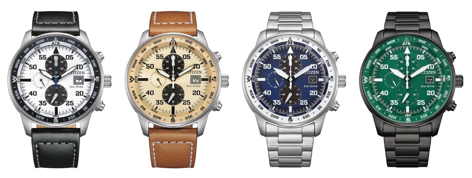 All of these Citizen watches have a decorative compass ring and a simple date indicator. There are three dials, one of which shows the time in a 24 hour format, and the other is linked to the chronograph function. These timepieces use the Eco-Drive B612 caliber, allowing them to be powered by light. There are also features like an insufficient charge warning and an overcharge prevention function.