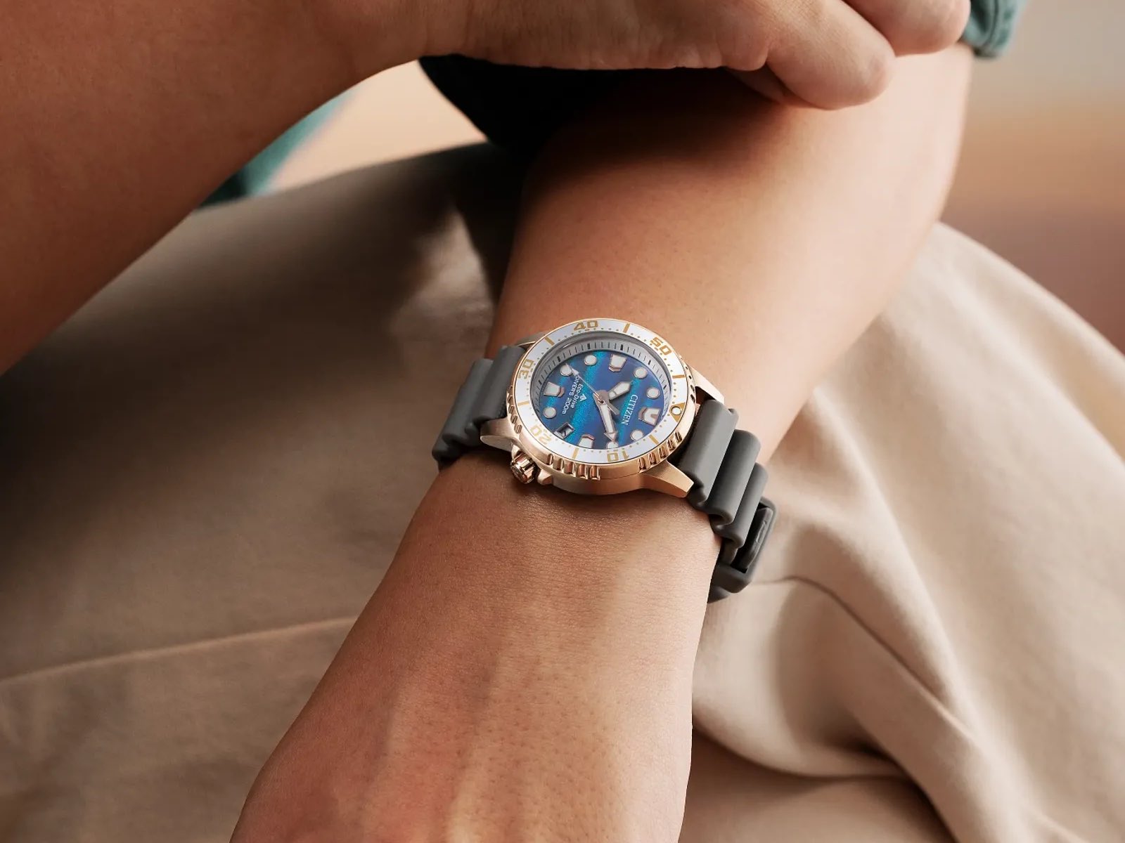 The watch is powered by Citizen’s in-house Eco-Drive E168 movement, which keeps the watch charged up from any light source and eliminates the need for battery replacements. The watch features a compact 36.5mm rose gold-tone stainless steel case, making it one of the more wearable dive options in Citizen’s lineup, especially for smaller wrists, and it's fitted with a BENEBiOL's PU strap made from plant-based material.