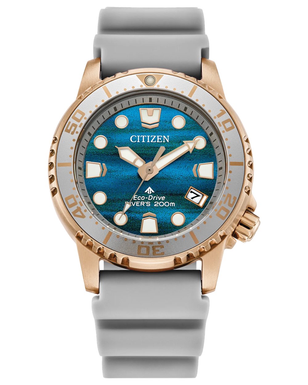 Citizen definitely deserves props for pulling off such a visually arresting dial. Citizen says it's inspired by the ever-shifting hues of the sea, with shimmering tones that move between deep blue and teal when light shines on it—there are even hints of violet at different angles. The silver-colored bezel features rose-gold minute markings and a luminous pip at 12 o’clock. The chapter ring is also silver, with applied hour markers and broad hands, finished in a warm rose gold tone with generous lume.
