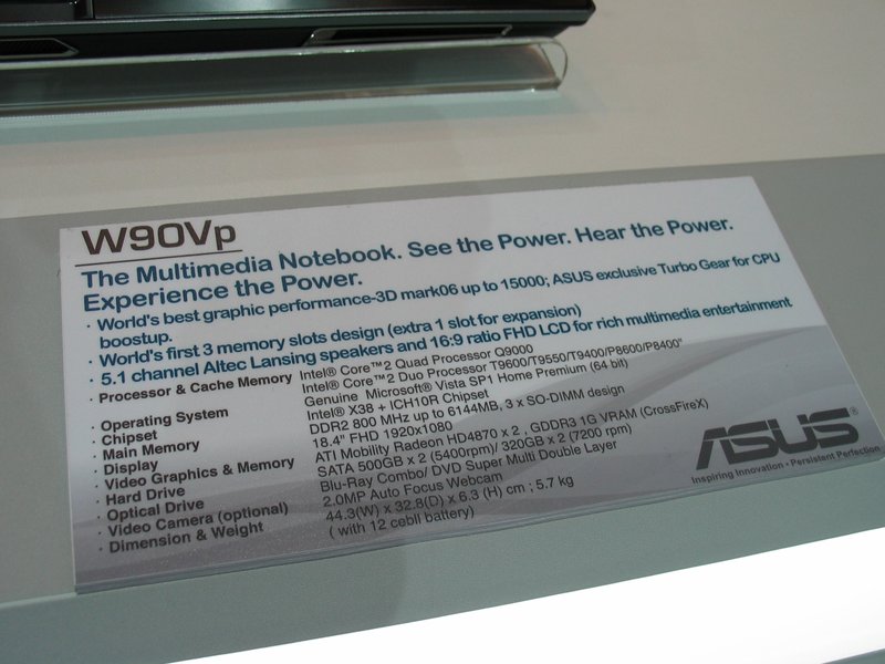A further highlight at Asus' stand is without a doubt the W90Vp gaming notebook, probably having the strongest gaming configuration in a notebook, with an Intel Core 2 Quad Q9000 processor and two Mobility Radeon HD4870 graphic cards from ATI. Around 15 000 2D Marks 2006 should not be a problem for the notebook, according to ASUS. Rumor has it, believe it or not, that up to 20k points are made possible by not closer defined tuning measures. We are curious and looking forward to make an extensive test with a test sample.