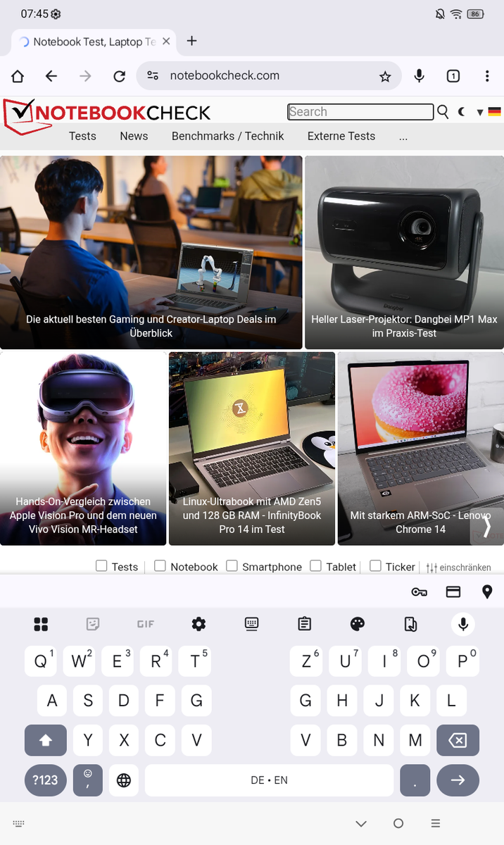 The software base is up-to-date with Android 15 and the update support is specified by the manufacturer as up to seven years, although the latter remains legally unclear. The performance of the Helio G85 also leaves some question marks for the future. Simple applications are completed satisfactorily, but more demanding tasks and games are not the Tab One's domain.