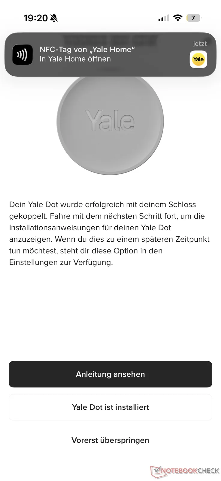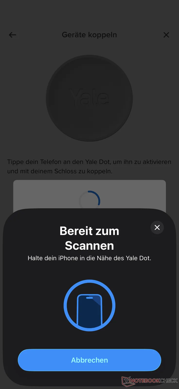 To open or close the Linus Smart Lock L2 Lite after simply setting up the Yale Dot via the app, all you have to do is hold your smartphone up to the small plastic disk. A small notification window appears at the top of the display (tested on an iPhone 16 Pro), which opens or closes the lock when tapped (depending on the status).