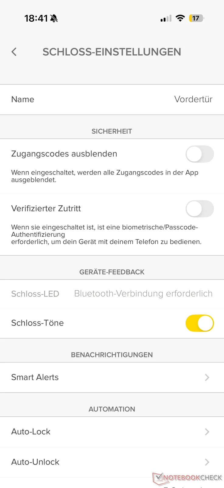 The app offers various options for adapting the behavior of the Smart Lock to your own needs - albeit with a few limitations. For example, the door lock can be locked automatically at a desired time (Auto-Lock). However, the Wi-Fi bridge is required for auto-unlock at a specific time, while unlocking when you get home (via device location) works via Bluetooth. Among other things, automations can be configured in conjunction with other Yale smart home products.