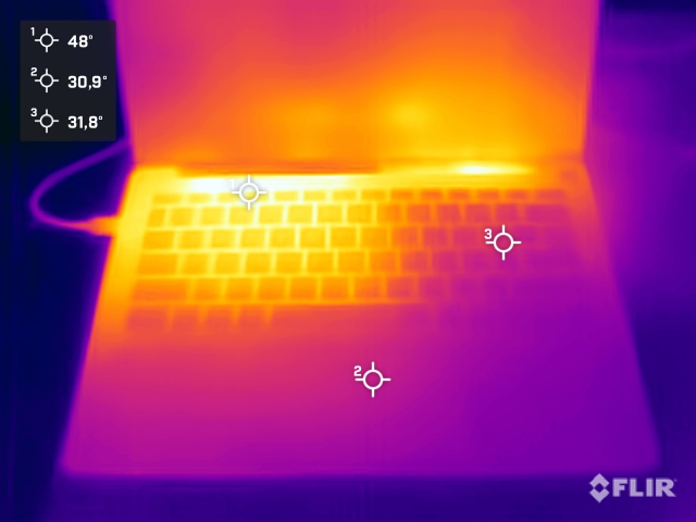 (+) The palmrests and touchpad are cooler than skin temperature with a maximum of 29.8 °C / 85.6 F and are therefore cool to the touch.