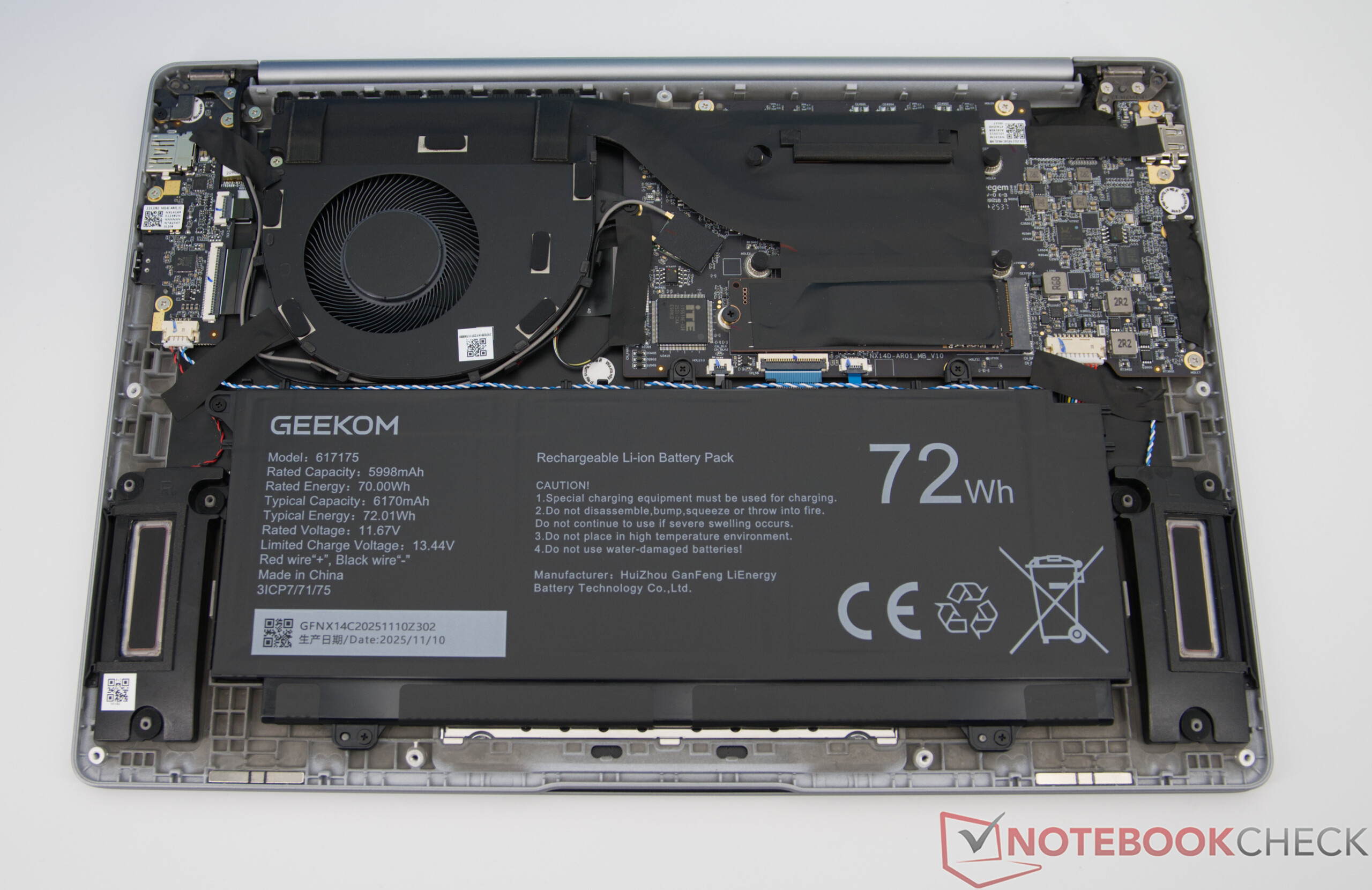 The GeekBook X14 Pro relies on a battery with a capacity of 72 Wh, which enables a decent runtime in mixed everyday use of office, web, and streaming and allows mobile working for several hours. Depending on usage, a large part of a working day can be managed without a power socket. If the battery is empty, a full charge takes around three hours.