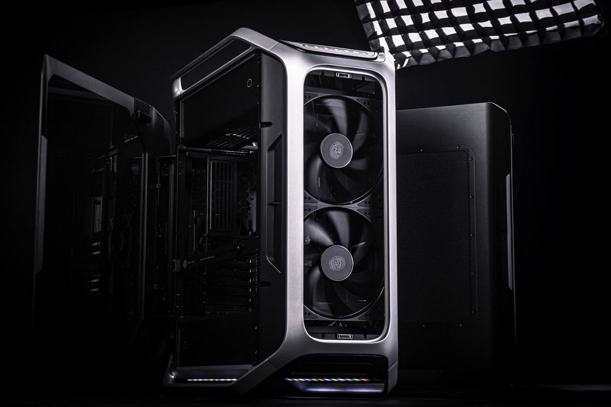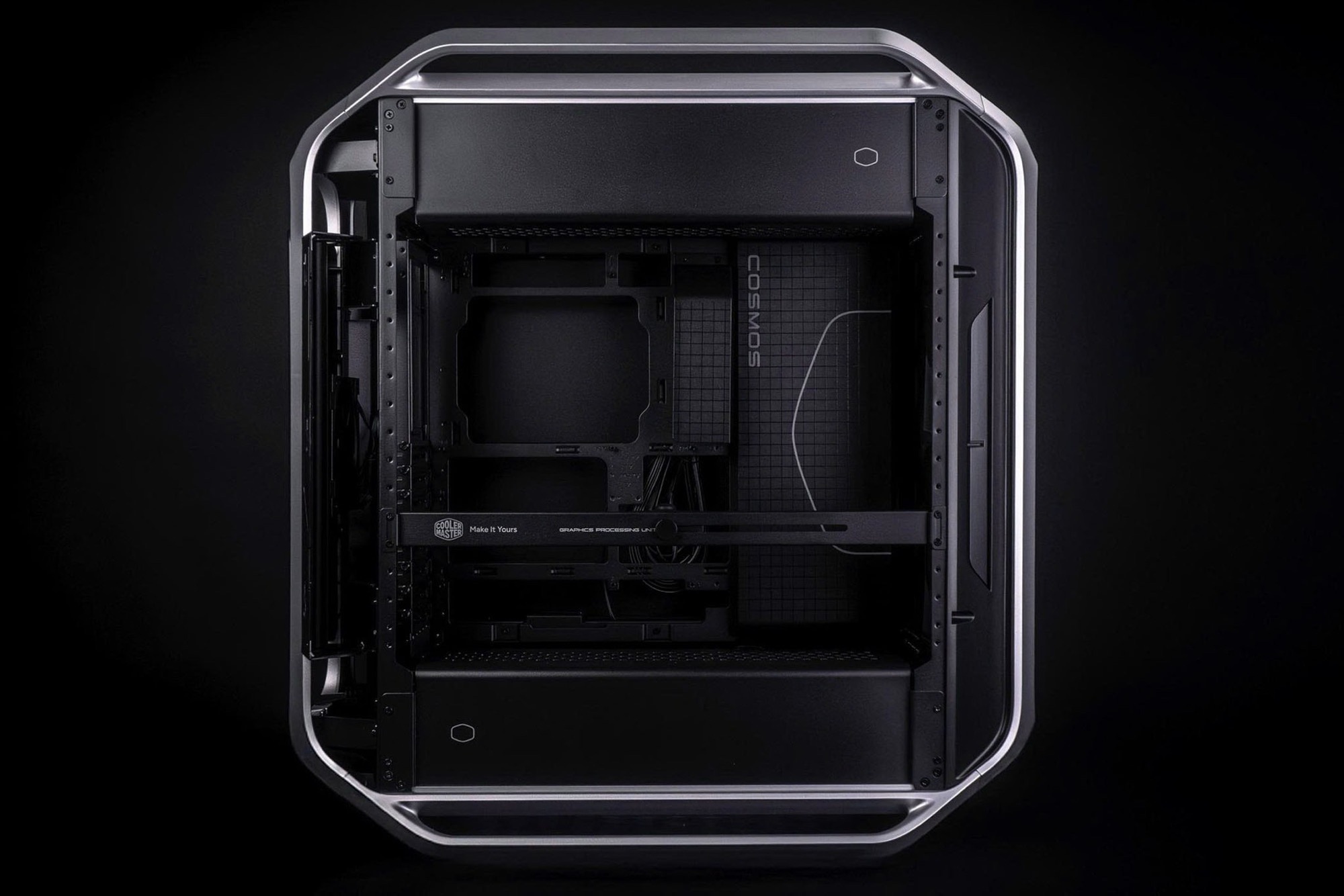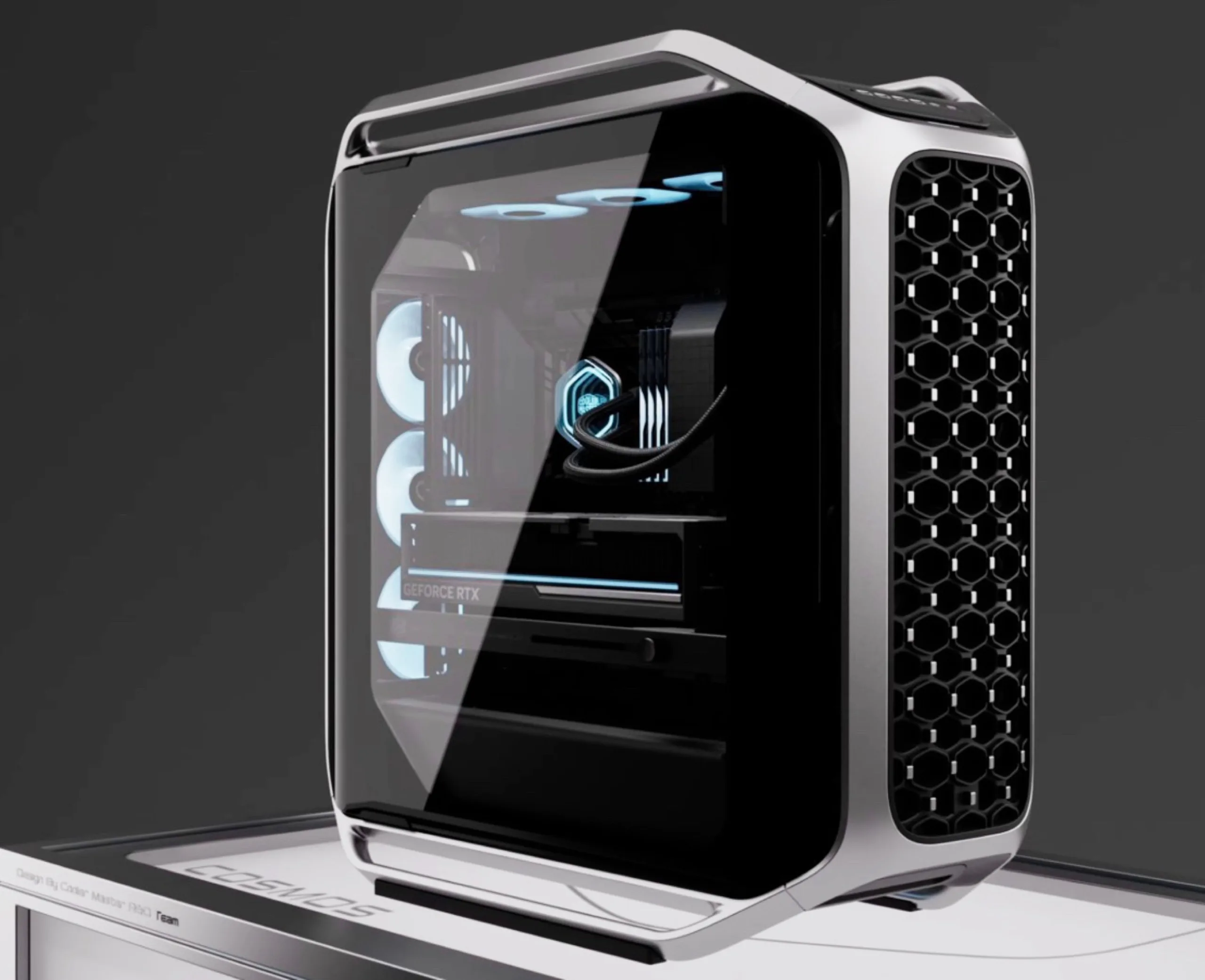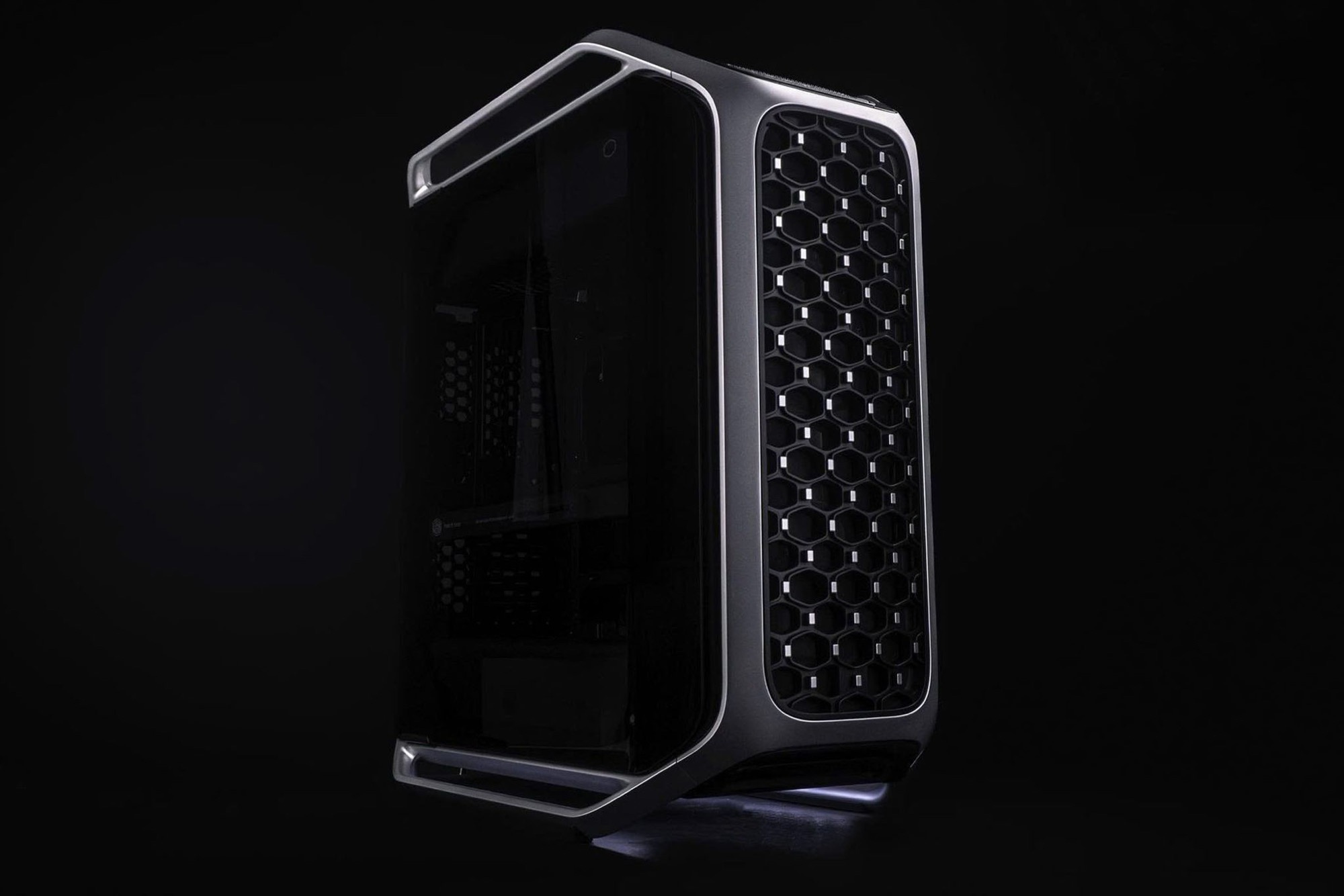 The Cooler Master Cosmos Alpha is a new flagship PC tower that combines an aluminum frame with a glass side panel. The frame seamlessly transitions into feet and handles, simplifying transport. The front panel is perforated in order to maximize airflow to the fans behind it.