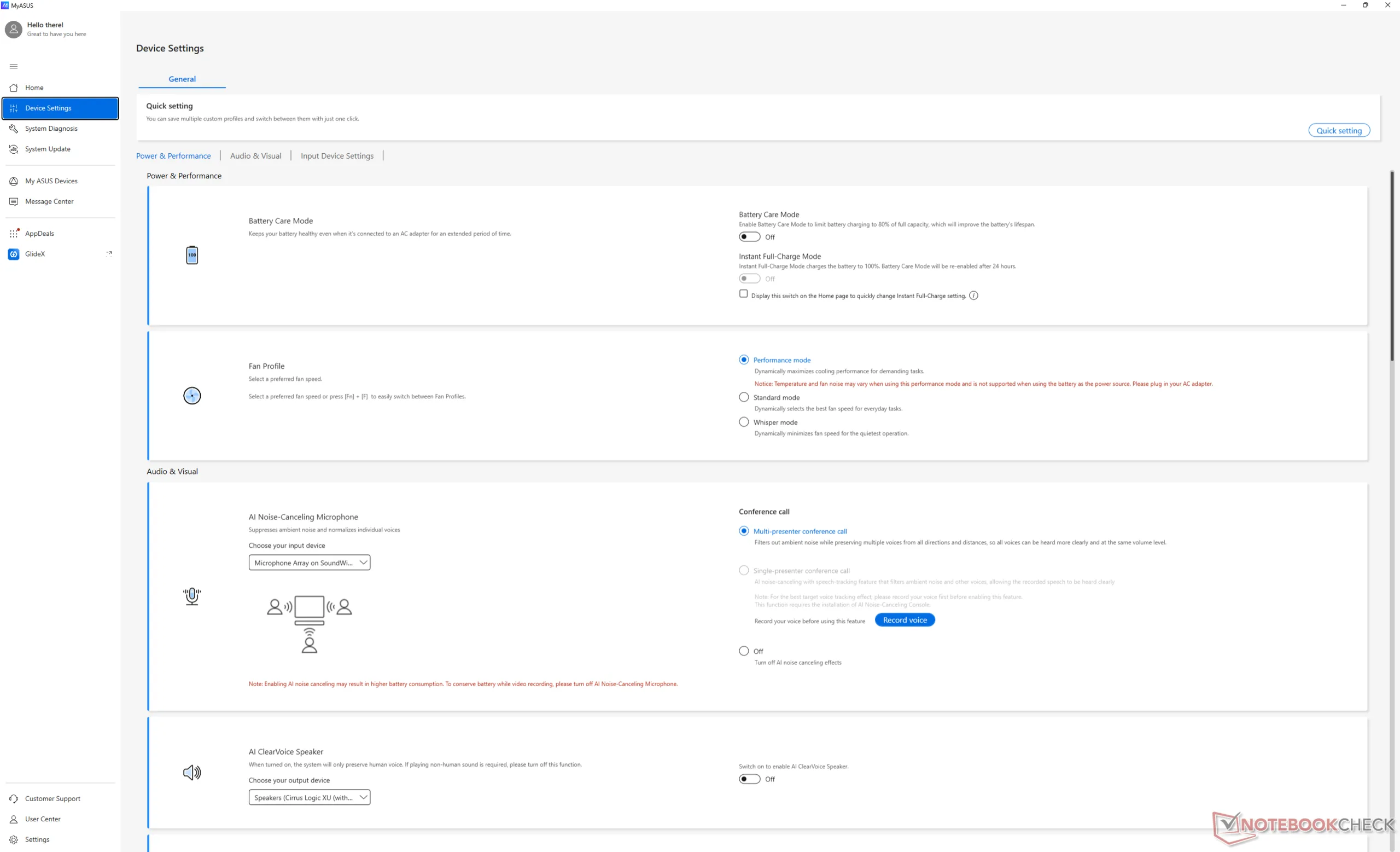 On the Asus ExpertBook Ultra, however, maximum processor performance comes with one condition: mains power. As shown by the screenshots below, running on batteries can slow performance by roughly 10 to 15 percent. The MyAsus software even confirms this with a red text stating "this performance mode is not supported when using the battery as the power source".