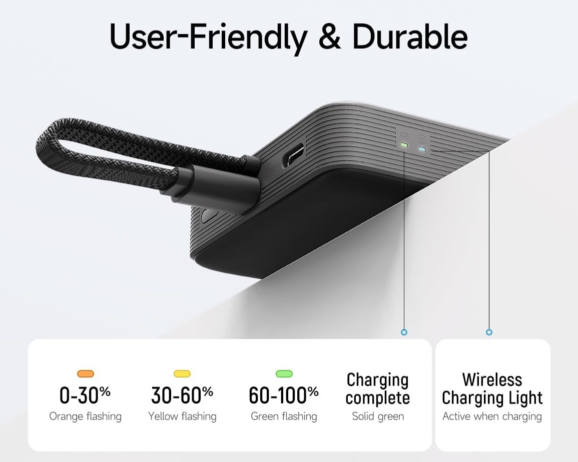 On the front of the Magnetic Power Bank CP12 is a wireless charging pad, delivering an up to 7.5W output. Your phone is held in place with magnets, said to support five times the weight of an iPhone 16. A second device can be charged via the integrated USB-C cable or USB-C port, providing up to 22.5W power. This higher output should charge an iPhone 16 to 46% in half an hour. When the USB-C cable and USB-C port are used simultaneously, the combined power output is capped at 15W. The braided cable is described as durable and has been shown to withstand at least 10,000 bends in testing. However, it appears that the cable is not replaceable should it break.