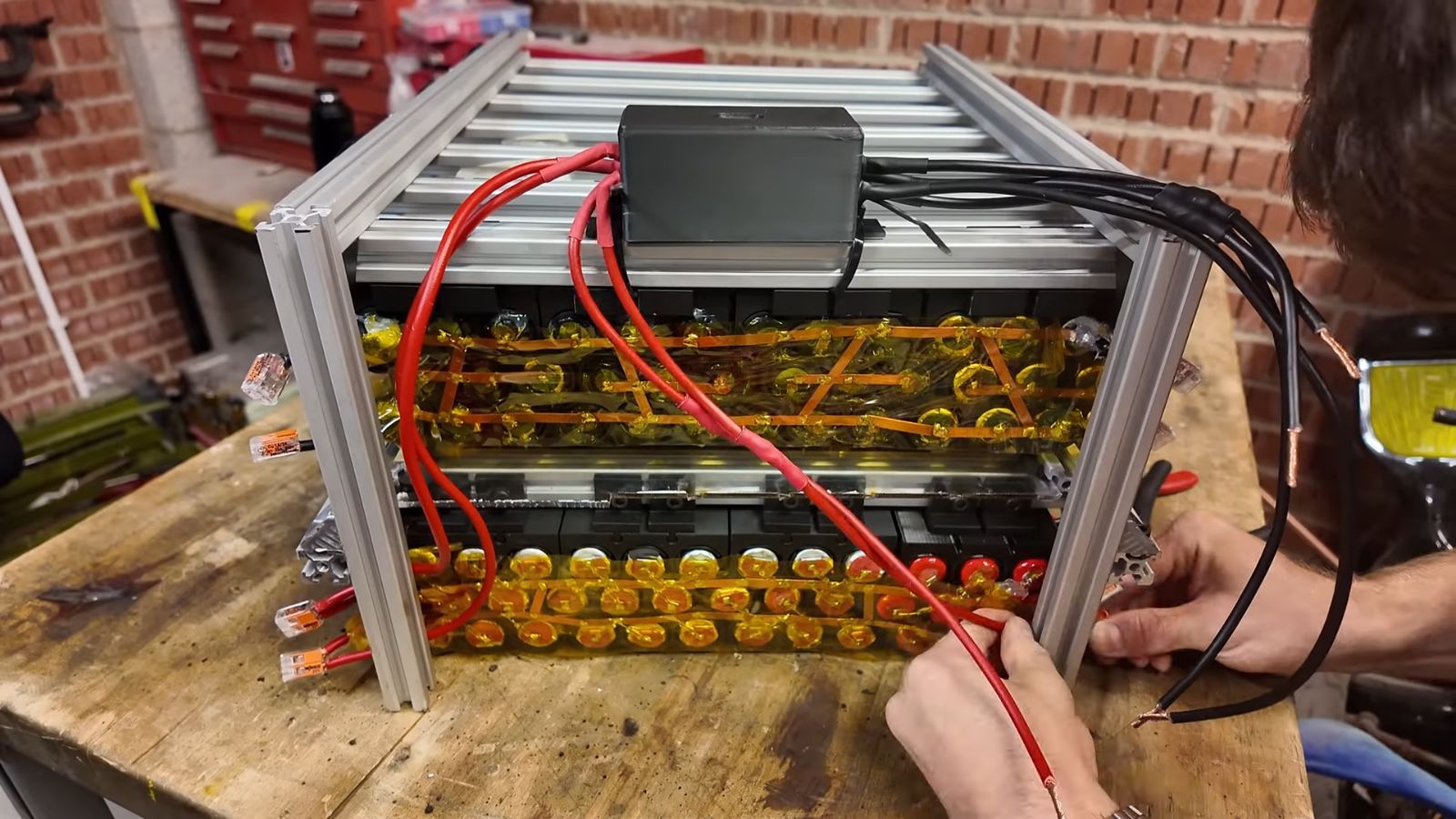 With the batteries ready, he 3D-printed frames to hold groups of nine batteries connected in parallel; these groups act just like modules in EV battery packs. He then connected the modules to form a battery pack.
