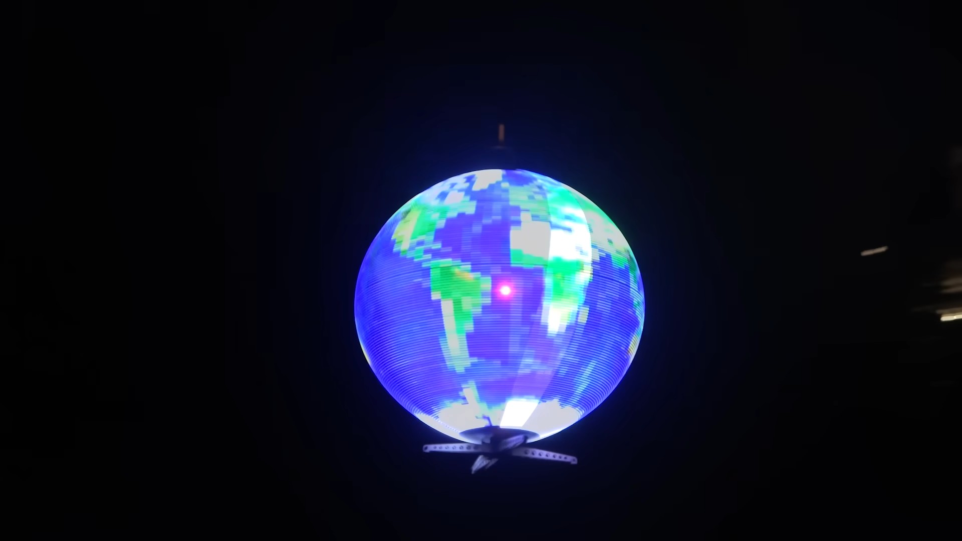 To make the display spin, he used a motor and a gear system attached to the drone's shaft. This made it a stability nightmare as the drone also spun in opposite direction to the display. To fix this, he attached two propellers to the shaft spinning in the same direction as the display, counteracting the spin from the gear system, thereby keeping the drone's shaft in place.