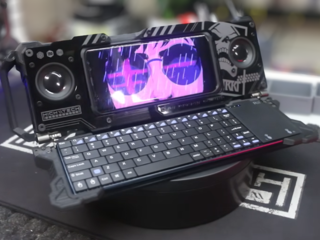 Instead of being a self-contained computer rig, it’s actually a DIY-crafted smartphone case that packs in some extra goodies. The cyberdeck ingeniously uses everyday components. It features a Bluetooth amplified wired to two 5W stereo speakers for booming audio. Furthermore, it features a mini tactical keyboard, complete with a touchpad for navigation and easy typing.