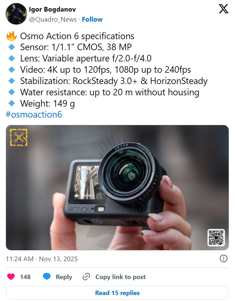 According to Quadro_News, the Osmo Action 6 will have a 1/1.1-inch 38 MP CMOS sensor and a variable-aperture lens ranging from f/2.0 to f/4.0. The model will support video capture at up to 4K 120 fps or 1080p 240 fps.