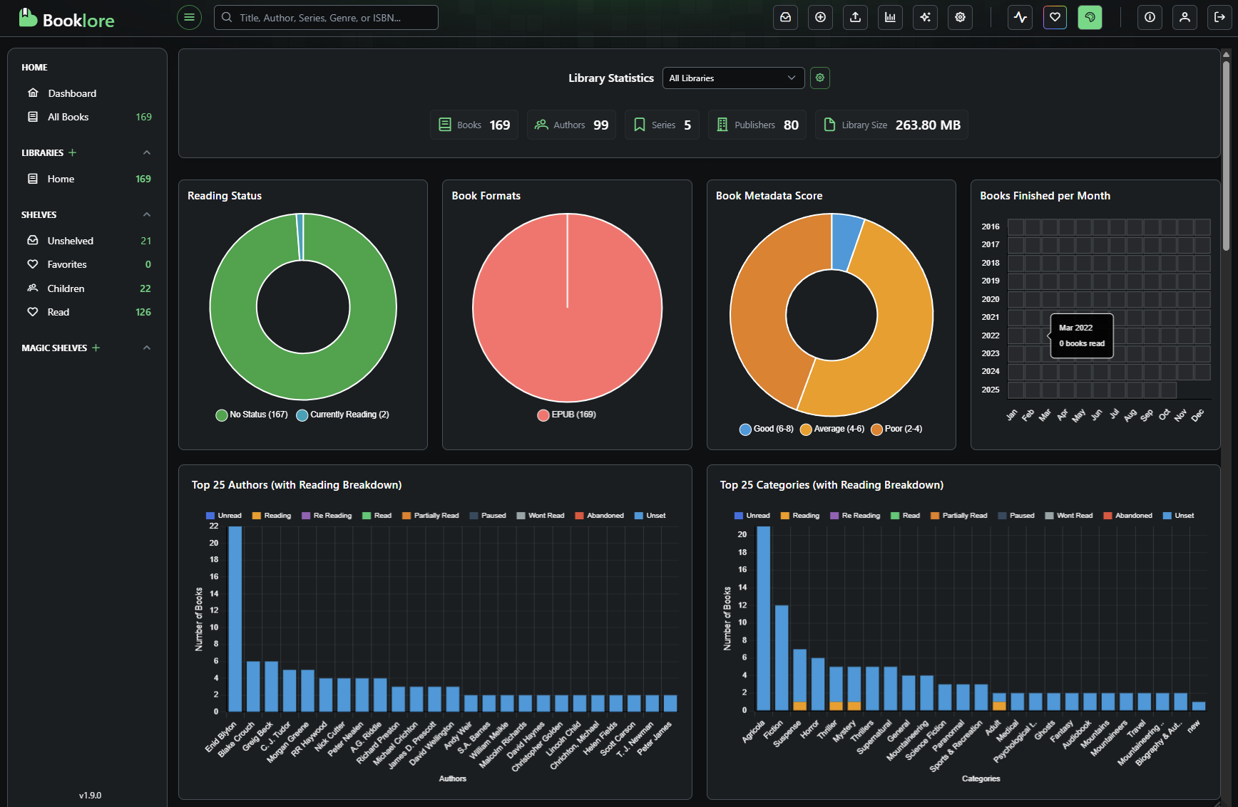 Booklore isn't just a book manager, the built-in reading functionality will turn any web browser into a platform-agnostic e-reader. While books can be downloaded or even emailed to your device of choice, using the built-in reader also keeps track of your reading statistics, letting you know what you've read, are currently reading, who your favourite authors are, what genres you read most, your reading patterns and a great deal more.