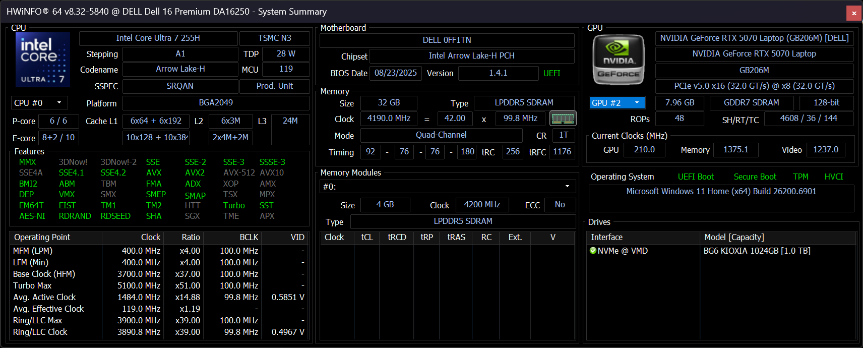 | Dell 16 Premium DA16250 Intel Core Ultra 7 255H ⎘ NVIDIA GeForce RTX 5070 Laptop ⎘ 32 GB Memory, 1024 GB SSD | Amazon: $3,599.00 List Price: 3300 USD | 2.3 kg | 18.7 mm | 16.30" 3840x2400 278 PPI OLED | |