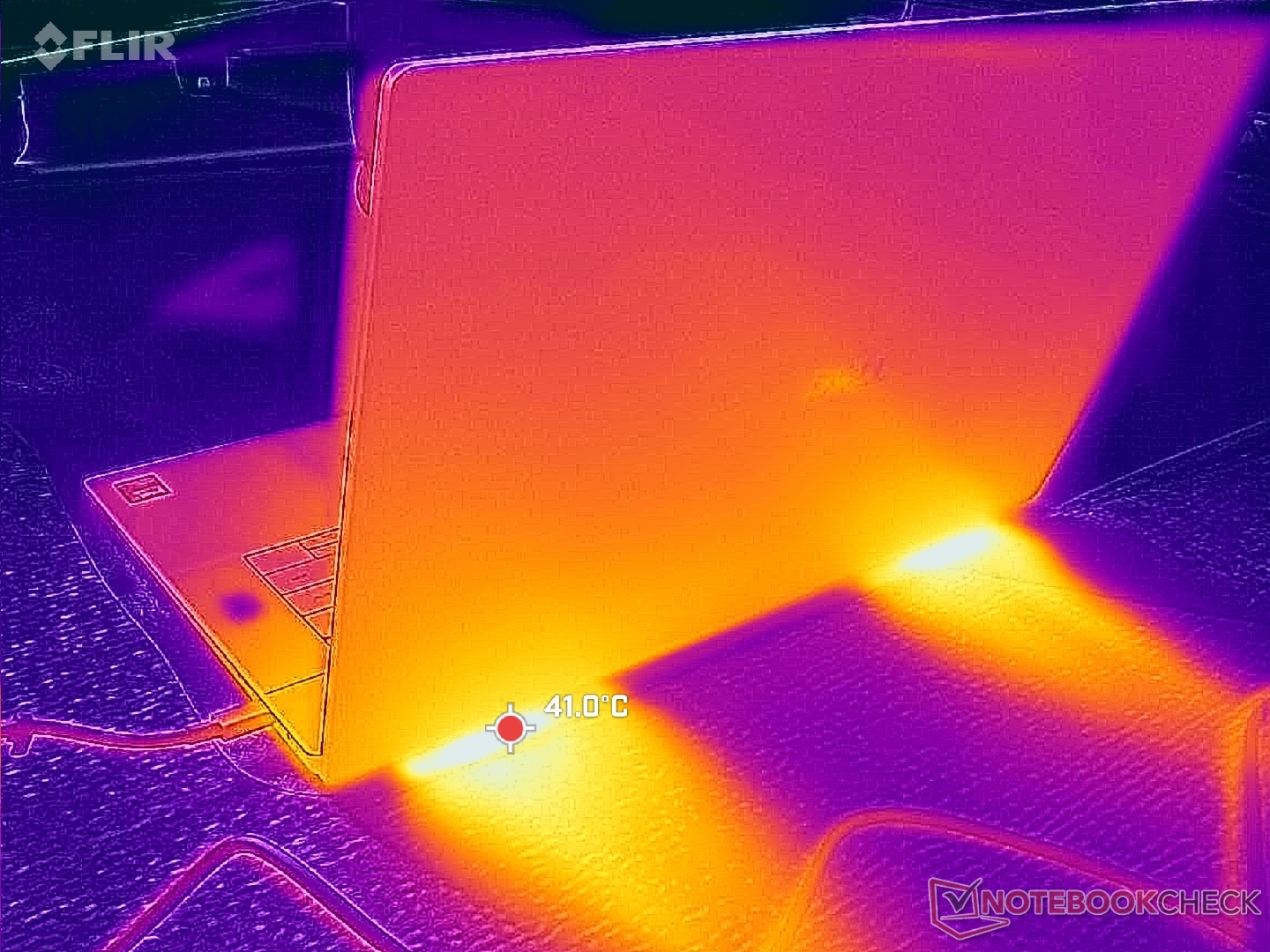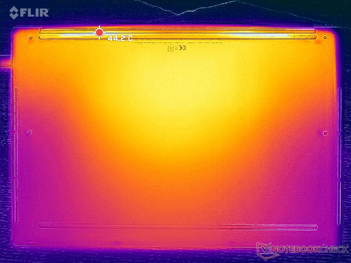 Hot spots on the bottom cover near the vents can reach almost 45 C when running demanding loads. We can't help but to wonder if additional ventilation holes would have improved overall temperatures, but Dell are clearly prioritizing the cleaner vent-free visual design a la the MacBook series.