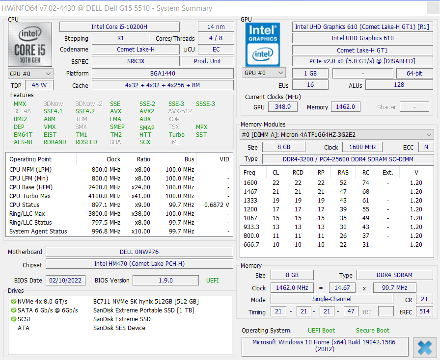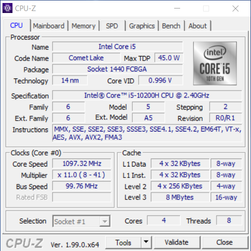 The built-in Core i5-10200H is part of Intel's 10th processor generation, and it's based on the Comet Lake architecture (4th generation of the Skylake architecture), which means that it's no longer brand-new. It's comprised of four cores (quad-core CPU) that operate at a base clock speed of 2.4 GHz and a maximum speed of 4.1 GHz. Dell has paired it with 8 GB of DDR4-3200 RAM.