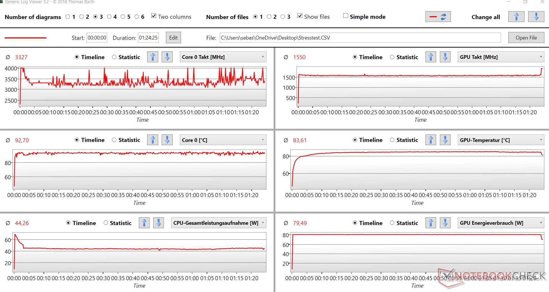 In the stress test (Prime95 and FurMark run for at least an hour), the CPU settles at around 3.3 GHz and a temperature of around 93 °C (~199 °F) after a brief initial peak at the limit. At an average of 1,550 MHz, the graphics card operates relatively just below its maximum at a constant level and a temperature of slightly below 85 °C (~185 °F). The system remains stable even under full load.