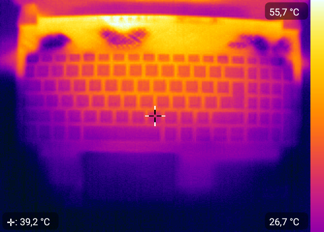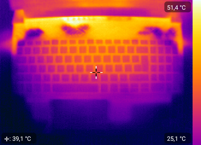 However, the touchpad and keyboard area remains so cool in all situations that it's possible to use the laptop without any issues. In idle usage, most parts of the gaming laptop are barely warmer than room temperature, but they're always above the values of the AMD version.
