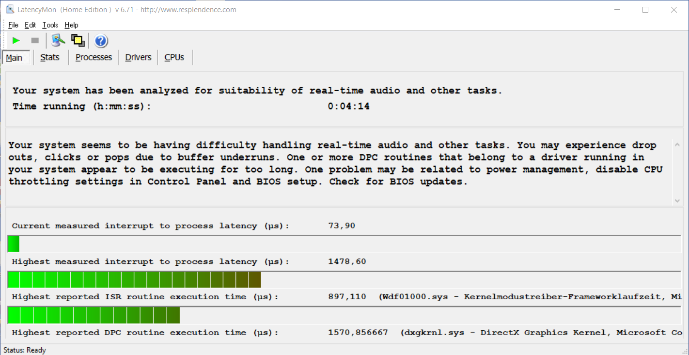 On battery power, the CPU clock rate drops to around 2.3 GHz and the GPU to about 700 MHz. Naturally, this hurts performance, but at least it's beneficial in terms of noise and heat development (60 to 70 °C (~140 °F to ~158 °F)).