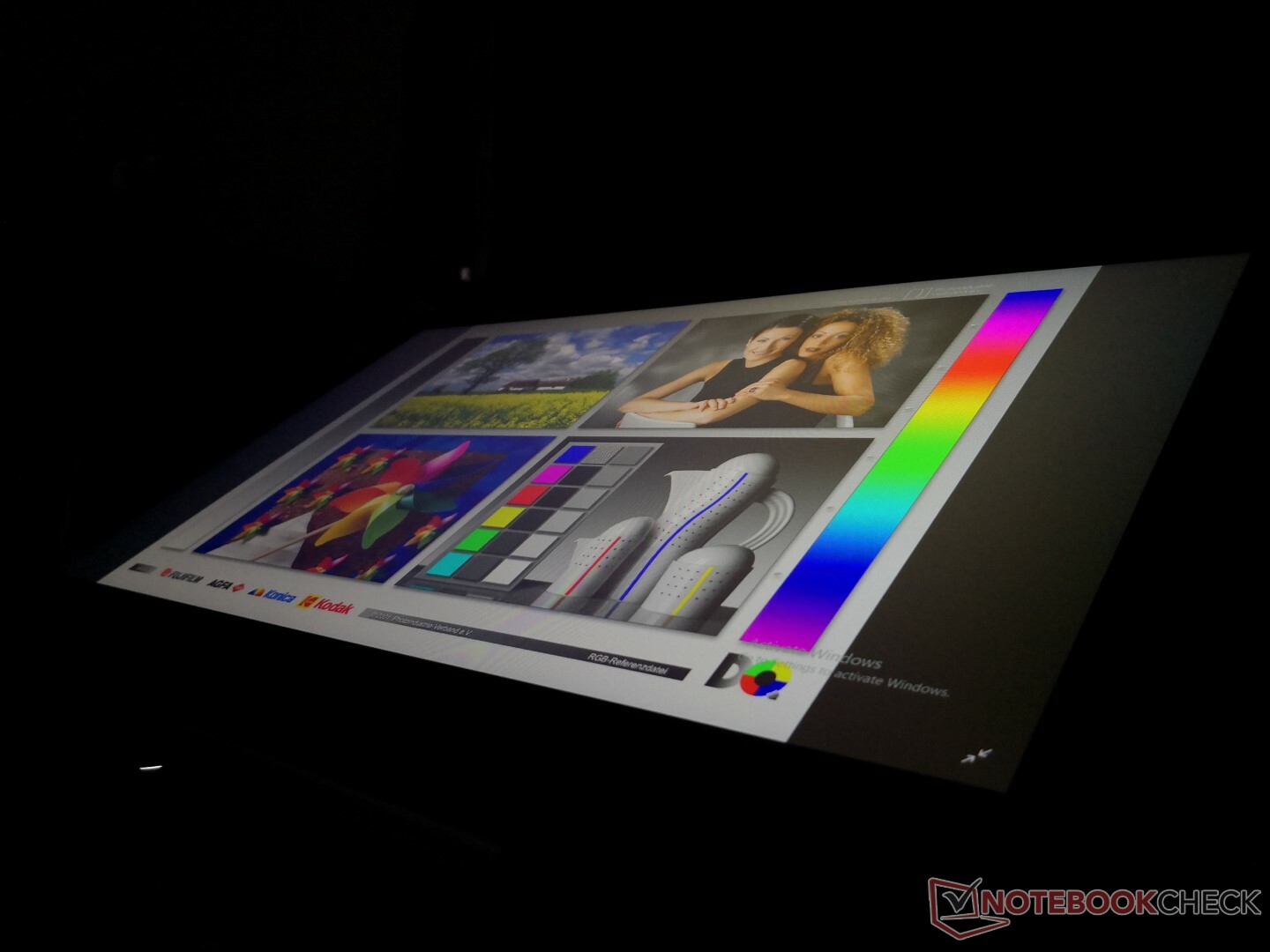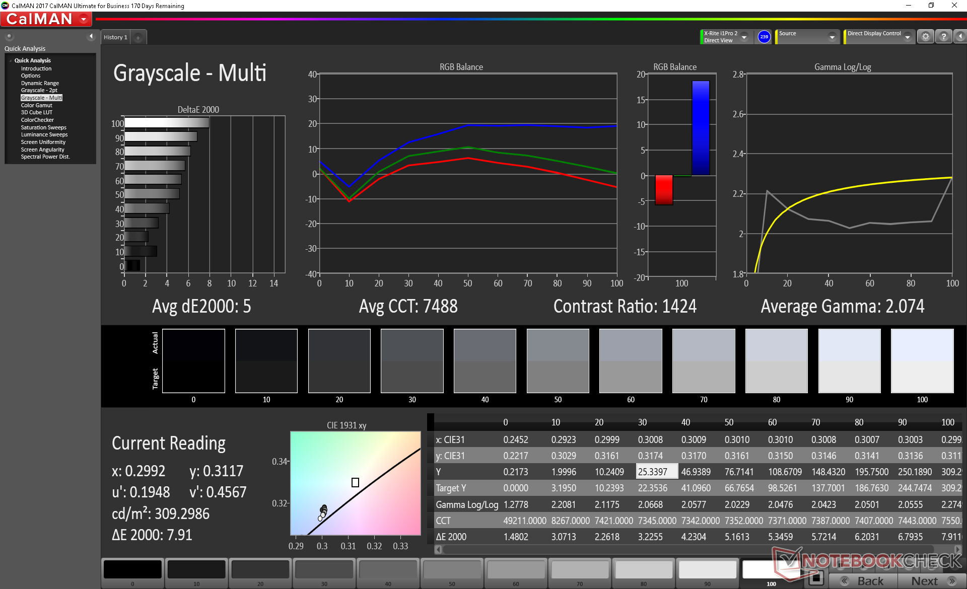 Further measurements with an X-Rite colorimeter reveal below average grayscale and colors due to the color temperature being too cool out of the box. Once calibrated, however, grayscale improves significantly from an average DeltaE of 5 to 1.7 leading to more accurate colors overall. We recommend an end-user calibration if possible to get the most out of the display. If not, users can still apply our ICM profile linked above.