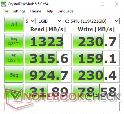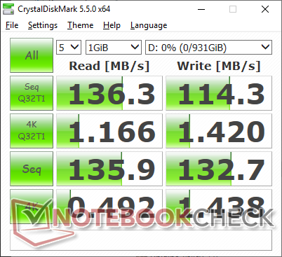 Transfer rates from the integrated card reader are limited to about 34 MB/s. Moving 1 GB of pictures from our UHS-II test card to desktop takes about 36 seconds compared to under 8 seconds on the XPS 15.