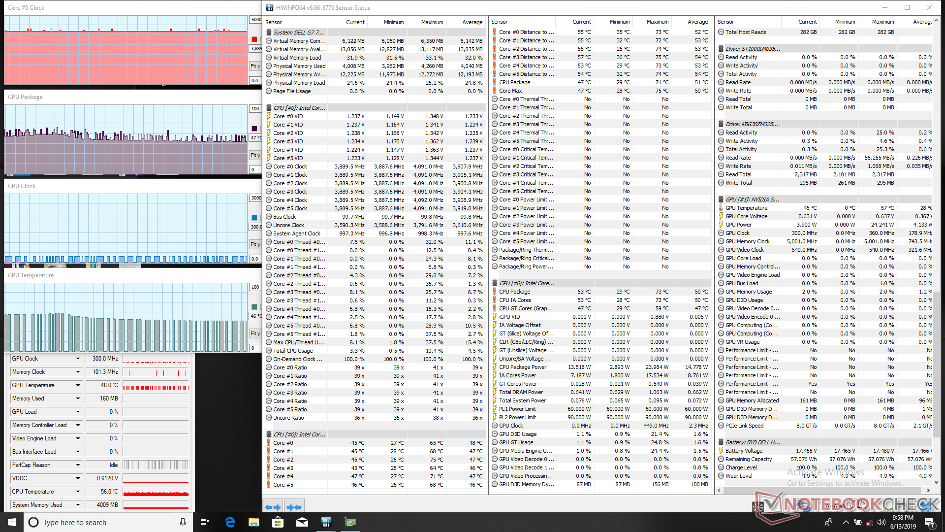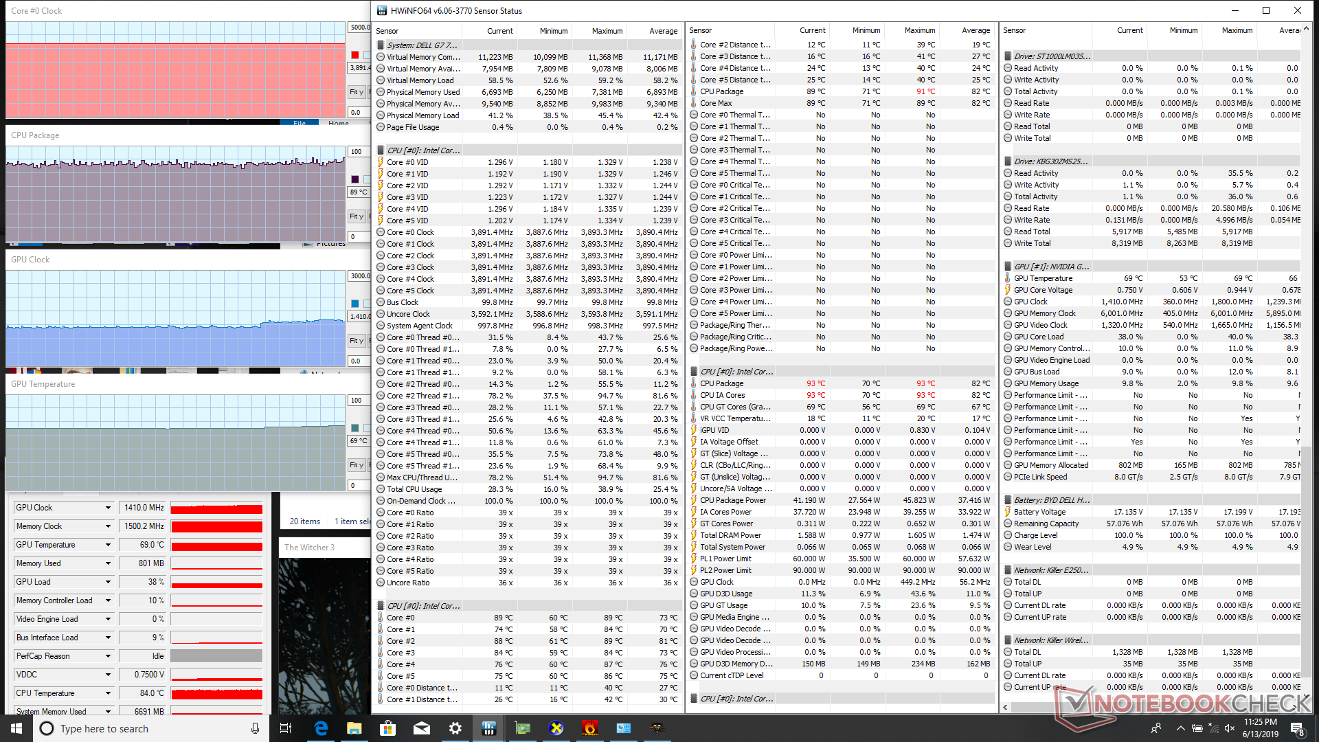 Running Witcher 3 is more representative of real-world gaming stress. We're able to record stable CPU and GPU temperatures of 89 C and 69 C, respectively. compared to 76 C and 66 C on the MSI GL73 8SE. The CPU temperature is a little high even for a gaming laptop.