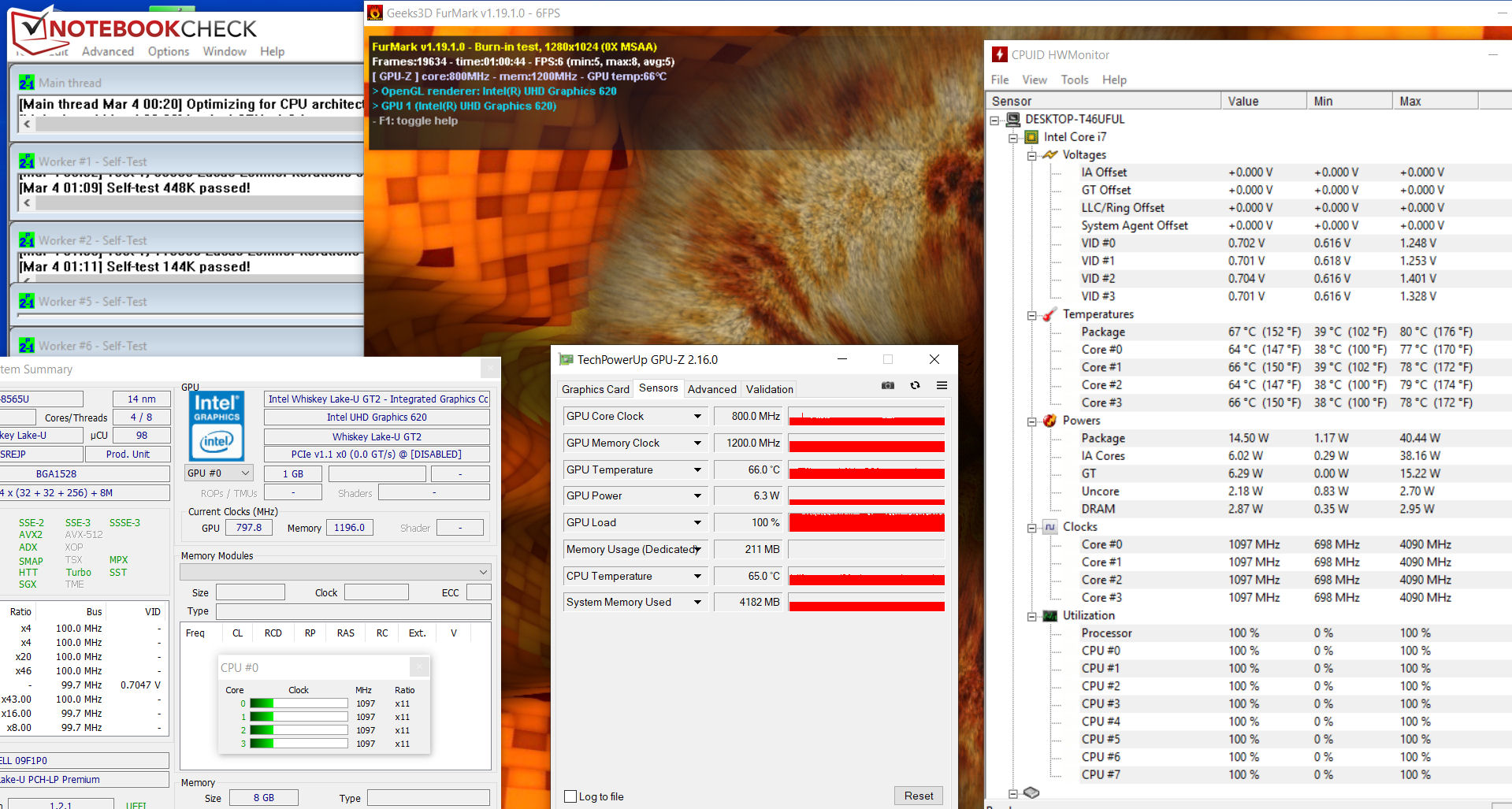 We also subjected our review unit to an hour-long combined FurMark and Prime95 stress test to determine how well it manages its performance under extreme load conditions. The 7380 performed just as well on battery as it did and battery power, but the CPU downclocked below its base clock speed to between 1 GHz and 1.1 GHz, while its GPU consistently operated at around 800 MHz.