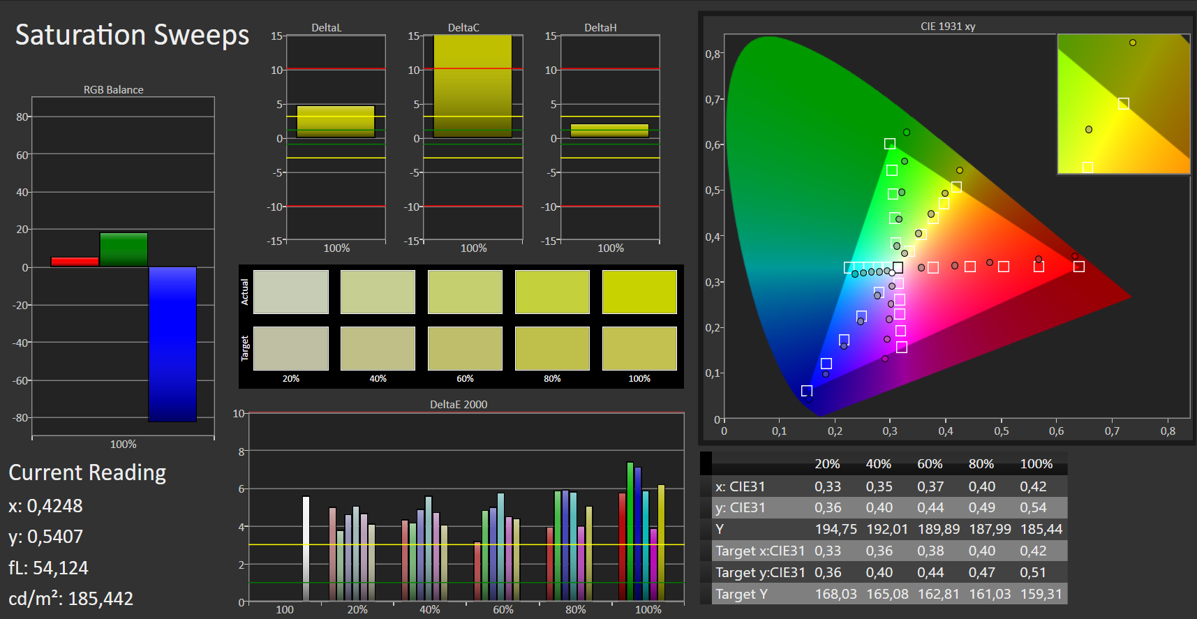 Our review unit has a DeltaE ColorChecker deviation of 5.81 out of the box, which is much higher than the ideal value of 3. The display does not have a blue tint to it as many displays do, which is impressive.