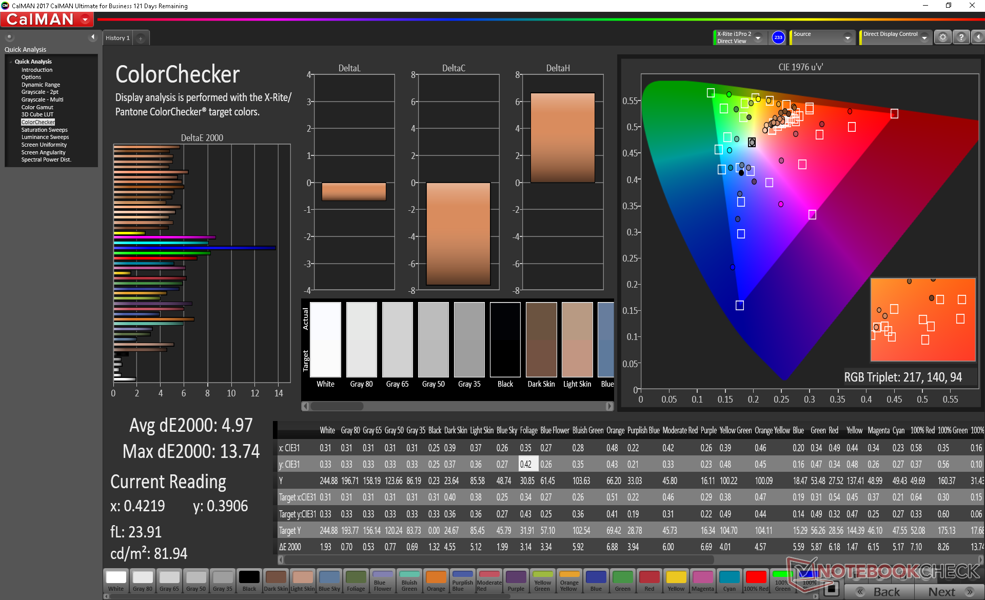 | Colorchecker dE 2000 max. * | 14.03 | 19.75 -41% | 23.45 -67% | 19.1 -36% | 14.7 -5% | 18 -28% |