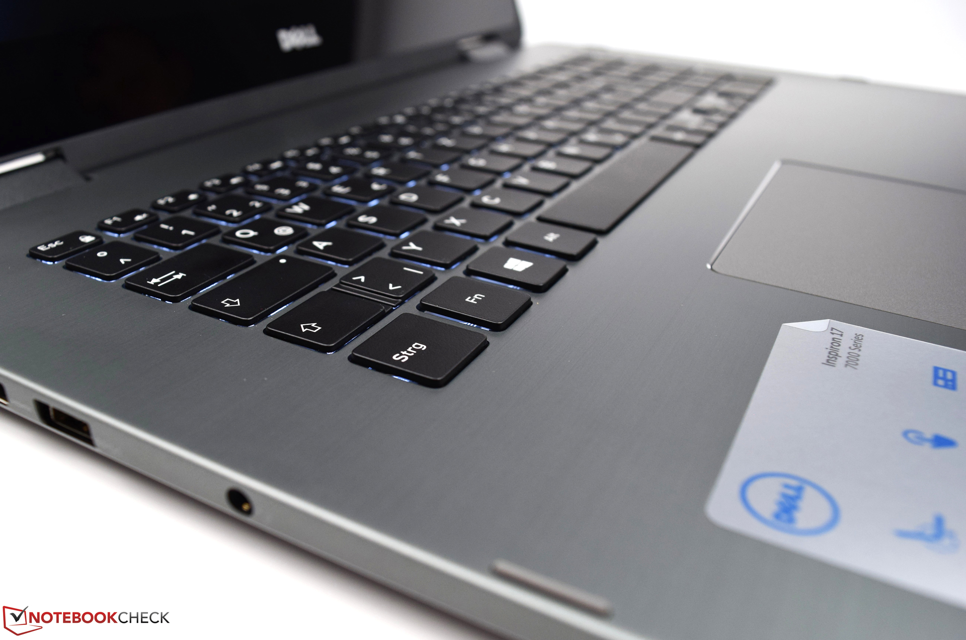 Unfortunately, Dell did not listen to the complaints about the predecessor, so the current Dell Inspiron 17 7773 is only equipped with a mediocre keyboard. The size of the keys is okay, even if the keys of the number pad turn out slightly smaller, possibly causing some problems for users with large hands. The small stroke is suitable for the chiclet keyboard, but the pressure point is limited and the cushioned stroke makes for a spongy typing experience. The typing noise is comfortably quiet. Due to the keys sticking out of the keyboard, the risk of damage is much higher in the presentation mode. We liked the white labels that are easily readable, and the two-step backlight helps in bad light conditions.