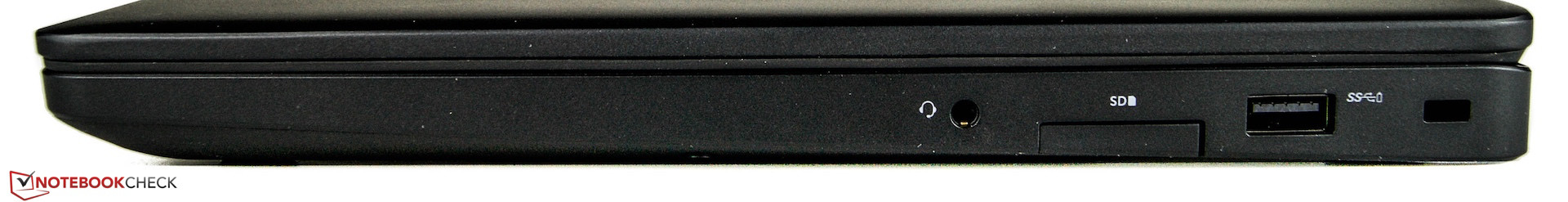 The manufacturer did not change the port layout and distributes all the ports very cleverly at almost all the sides. At the back are the stationary ports (Ethernet, VGA, HDMI, 1x USB 3.0, power), so the space on the desk is not limited. Peripherals like mice can be attached via USB at the side (one on each side). Specialties of the business device are a SmartCard reader, NFC reader, fingerprint scanner and a SIM slot (WWAN module optional and not included). There is no Mini-DisplayPort, so you cannot drive a 4K panel at 60 Hz.