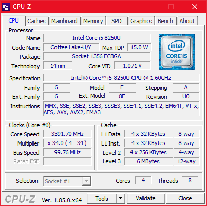 Our test device is powered by a Kaby Lake Refresh Intel Core i5-8250U quad-core processor. The 15 W ultra-low voltage (ULV) CPU has a 1.6 GHz base clock speed that can Turbo Boost up to 3.4 GHz when required.
