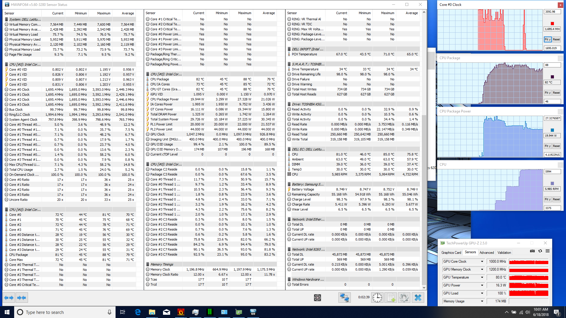 As we’d expect from our previous tests, full stress sees an initial jump to max turbo frequencies of 3.6 GHz and concomitant core temperature jumps to 98 °C, but several seconds later the machine relents and we instead witness drops to around the 2.6 – 2.7 GHz range, where it remains thereafter. GPU stress by itself, meanwhile, isn’t quite as challenging for the system; clock rates are fairly consistent within the 1000 – 1100 MHz range, and temperatures reach 88 °C.