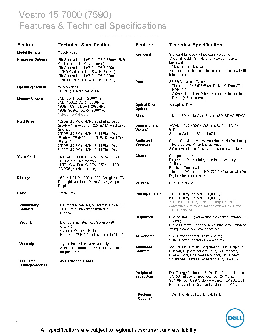 The second model is the larger and more powerful 15.6-inch Vostro 15 7000 7590. This costlier system utilizes more aluminum for a stronger first impression with narrow bezels to keep weight and dimensions in check. In contrast to the 15 W U-class CPUs and MX250 GPU of the Vistro 13 5390, the Vostro 15 7590 includes 45 W Core i9-9880H CPU and GeForce GTX 1650 GPU options for significantly faster performance.