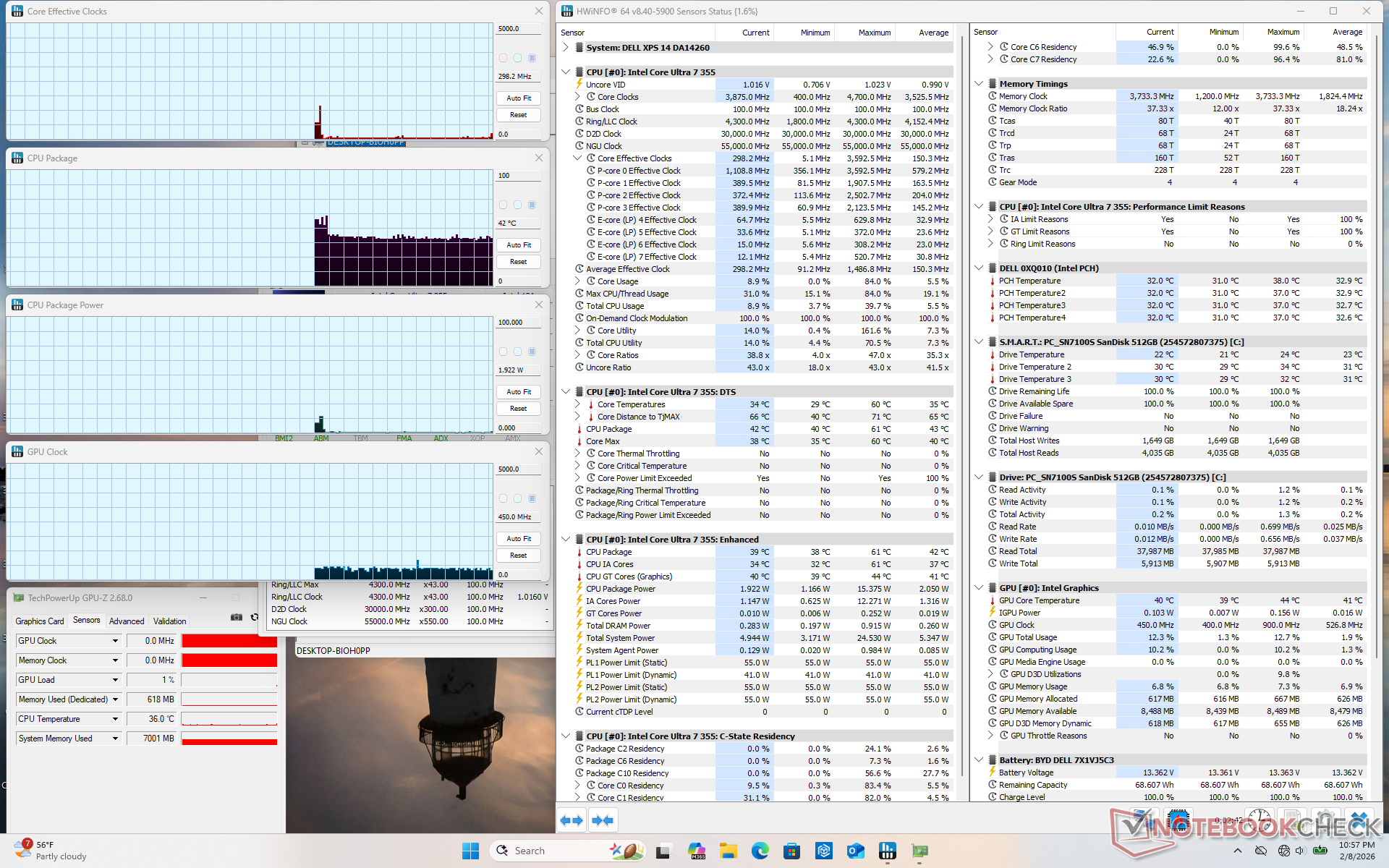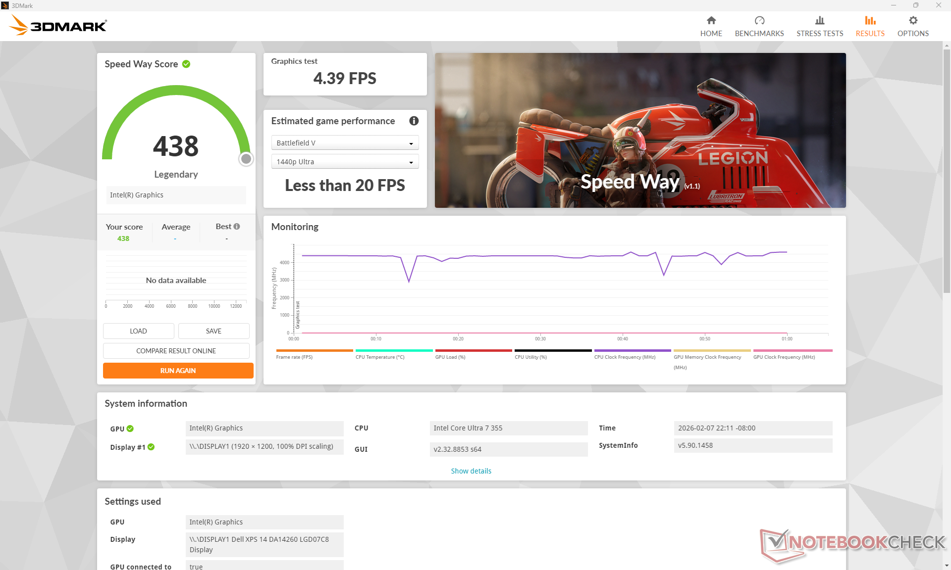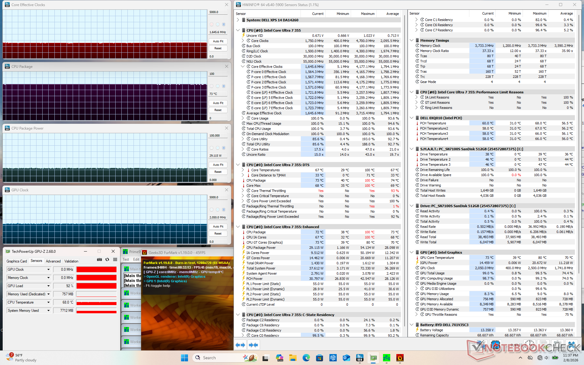 Unfortunately, the Core Ultra 7 355 doesn't inherit many of the performance-per-watt benefits of the Core Ultra X7 series. When running Prime95 on an external monitor, for example, the system would consume just 13 percent less than the Core Ultra X7 XPS 14 while offering 40 percent slower performance. Similarly, running Cyberpunk 2077 or FurMark would demand only 7 to 15 percent less energy while suffering from a significant 60 percent drop in graphics performance.
