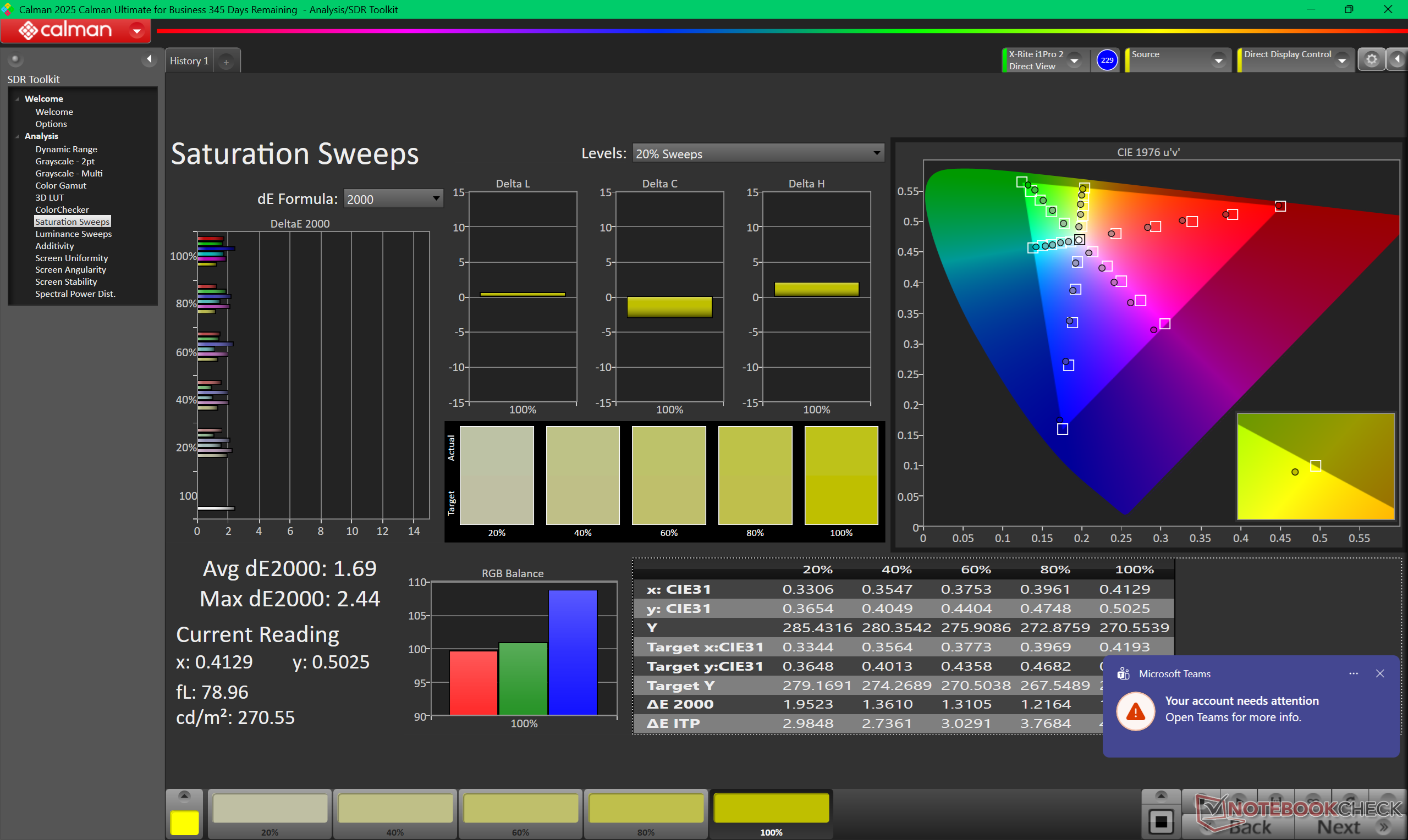 While the display comes decently calibrated out of the box, there is still room for slight improvements. Calibrating the panel ourselves with an X-Rite colorimeter would improve average grayscale and color deltaE values from 2.5 and 2.09 to just 1.7 and 1.09, respectively, while also bumping the color temperature closer to the 6500K target.