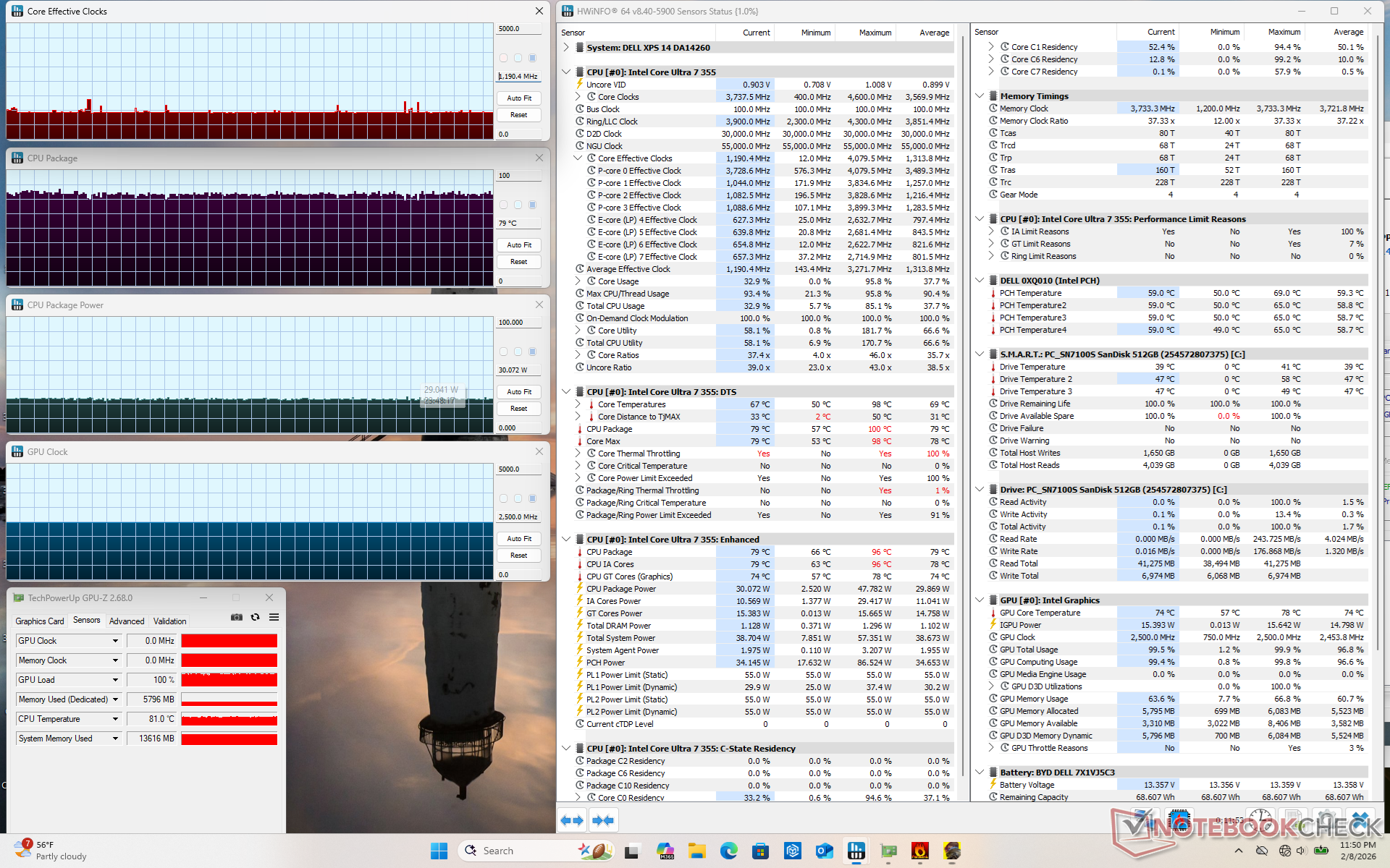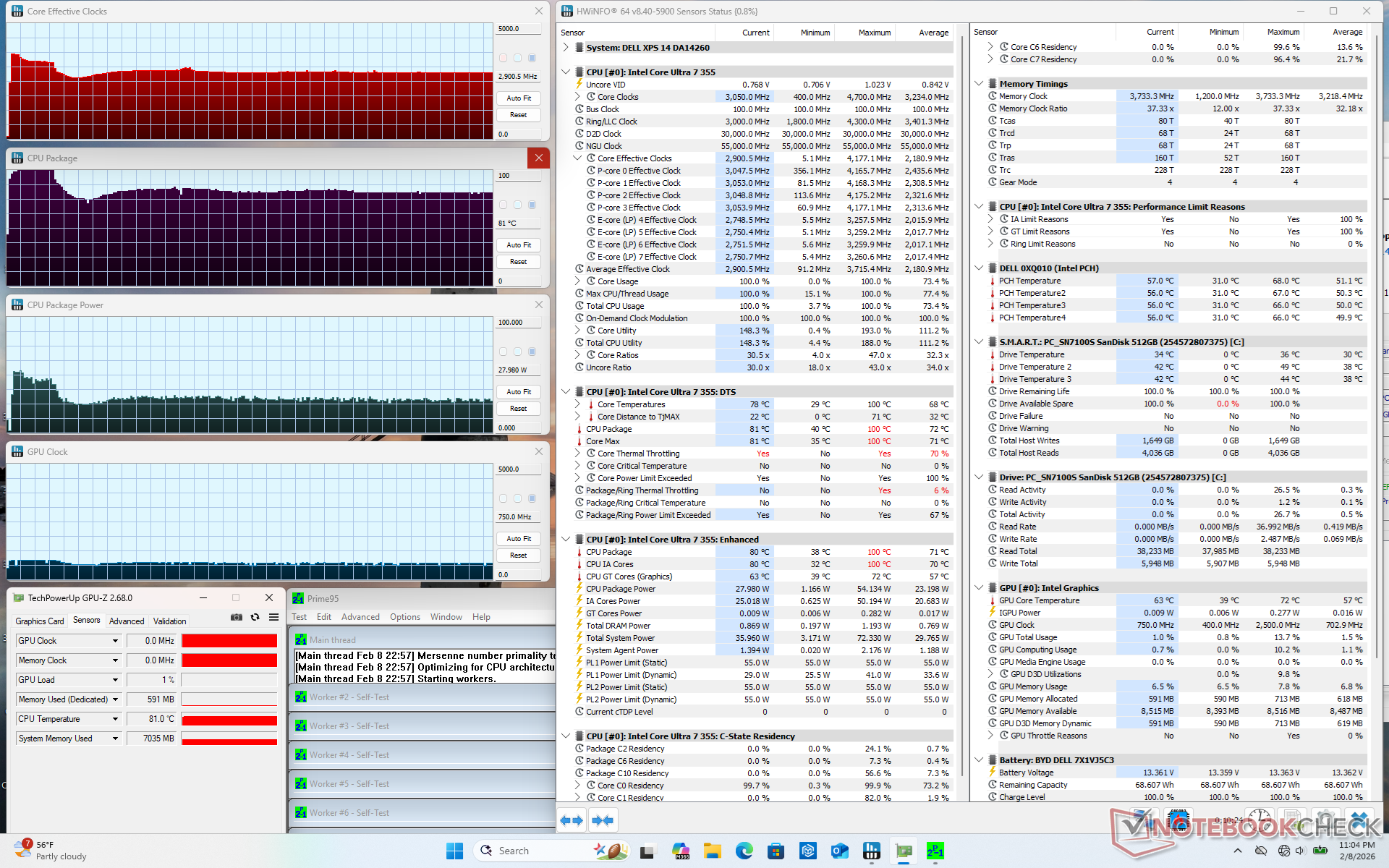 When running Prime95 stress, the CPU would boost to 3.7 GHz and 54 W lasting for only a few seconds at 100 C. Thereafter, it would stabilize at 2.9 GHz, 28 W, and 81 C to represent limited Turbo Boost potential. Core temperature would plateau at the lower 80 C range when running demanding loads which is slightly cooler than what we recorded on last year's Arrow Lake-H Dell 14 Premium.