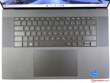 We don't have to say much about the case of the XPS 17, since the workmanship offers an extremely high quality, and the construction is very robust. With its very slim bezels (resulting in a screen-to-body ratio of 91%), the device continues to look very modern and not aged at all. However, the black carbon design on the top of the base unit still gets dirty easily. When you handle the XPS 17, it quickly becomes clear that it is not a light laptop, and our scale shows almost 2.5 kg (~5.5 lb). For the power supply, you also have to add another 400 grams (~0.9 lb).
