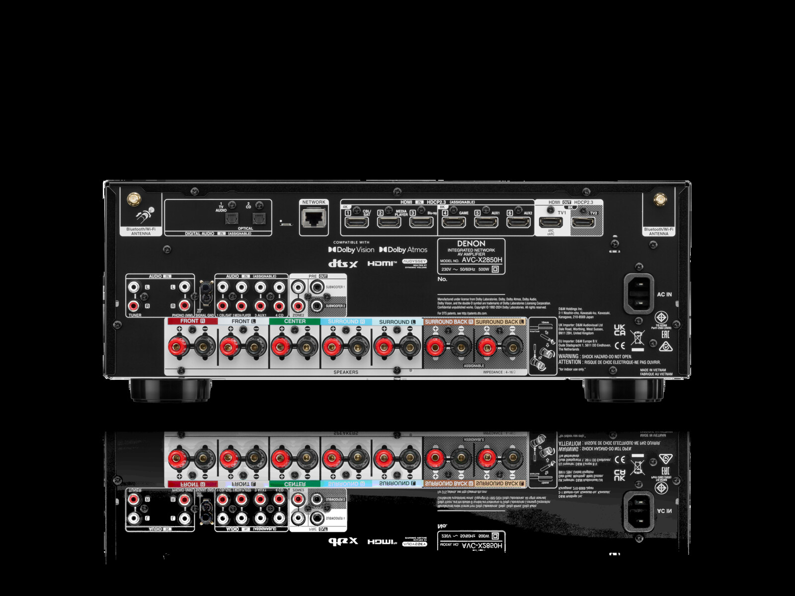 In addition to 8K video and 4K upscaling, the Denon AVC-X2850H supports Dolby Atmos and DTS:X, among other features. The 7.2 channels can also be configured as a 5.2.2 Dolby Atmos or DTS:X setup. The AVR manufacturer further promises clear and dynamic sound thanks to high-current amplifiers and support for playback formats up to 24-bit/192 kHz.