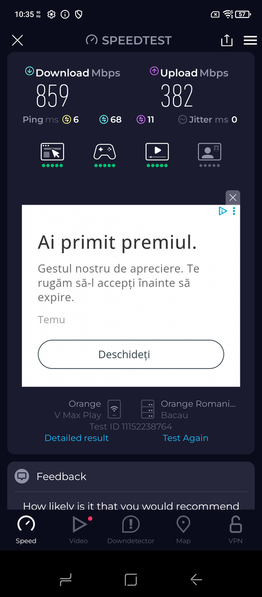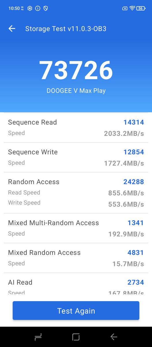 Its 512-GB data storage chip is impressively fast, with ~2 GB/s sequential reads. The 16 GB of RAM and the SoC used are sufficient for most tasks, too; AnTuTu believes the V Max Play tested is built around Mediatek's Dimensity 7300X, which is not much different from the Dimensity 7300. Both feature 4 "big" and 4 "little" cores with moderate clock speeds.