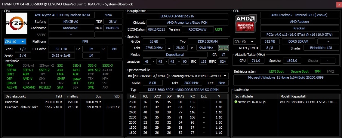 In terms of build quality alone, the IdeaPad Slim 5 16AKP10 makes a solid to very solid impression. The input devices are convincing, and both the chassis quality and the overall design stand out positively. The port selection is not especially modern, although Lenovo does at least retain a microSD card reader, which many manufacturers have now removed entirely. The 16:10 display leaves us with mixed feelings. The contrast ratio is perfectly respectable for an IPS panel, but the colour space gamut is disappointing, which especially affects photo and video playback. We were also somewhat underwhelmed by the performance of the Ryzen AI 5 330, or more precisely the integrated Radeon 820M. The specifications make it clear that this configuration is not designed for high performance, yet competing laptops with similar or only slightly higher prices pull ahead noticeably in some scenarios (more on that later).