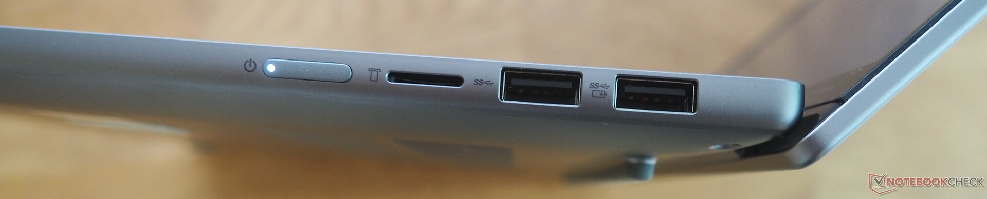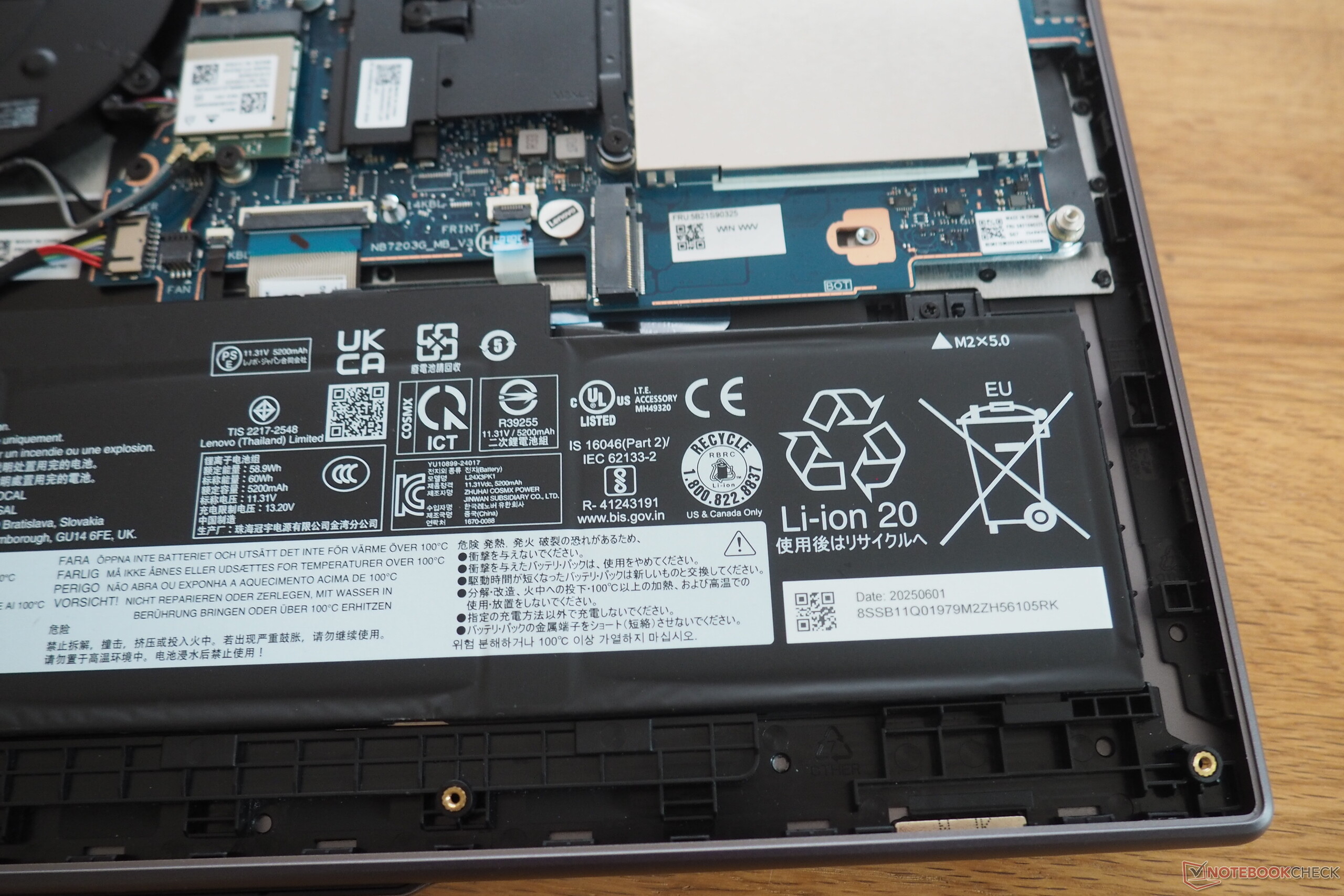 On the left side, you will find two USB-C 3.1 Gen 2 ports with DisplayPort 1.4 and PowerDelivery support, along with an HDMI output and a combined audio jack. The right side houses a reasonably fast microSD card reader and two conventional USB-A 3.0 ports. An Ethernet port is not included, but the laptop does feature a very fast Wi-Fi 7 module. The webcam, which includes a privacy shutter, offers only 0.9 MP resolution, yet still produces a sharper image than many competing models. The bottom cover is easy to remove after undoing six Torx screws. Inside, you will find two occupied SO-DIMM slots as well as two M.2 slots. The 2280 slot is free, while the installed SSD sits in the smaller 2242 slot.