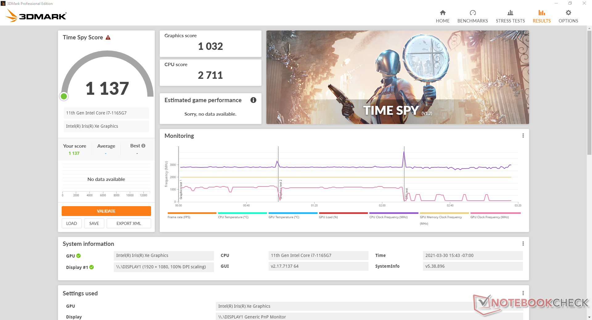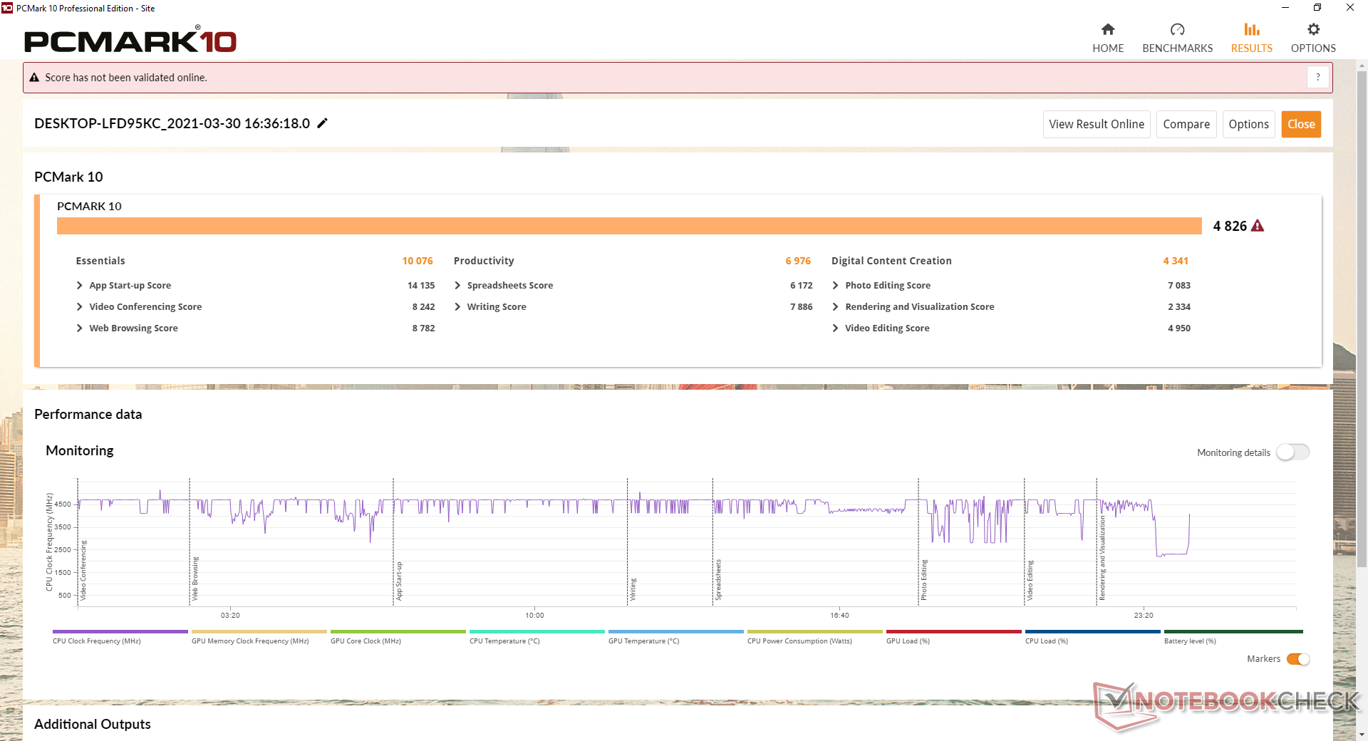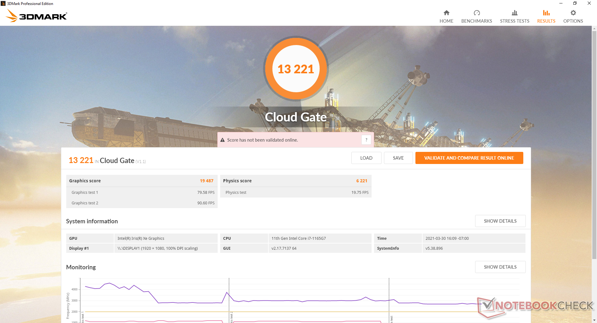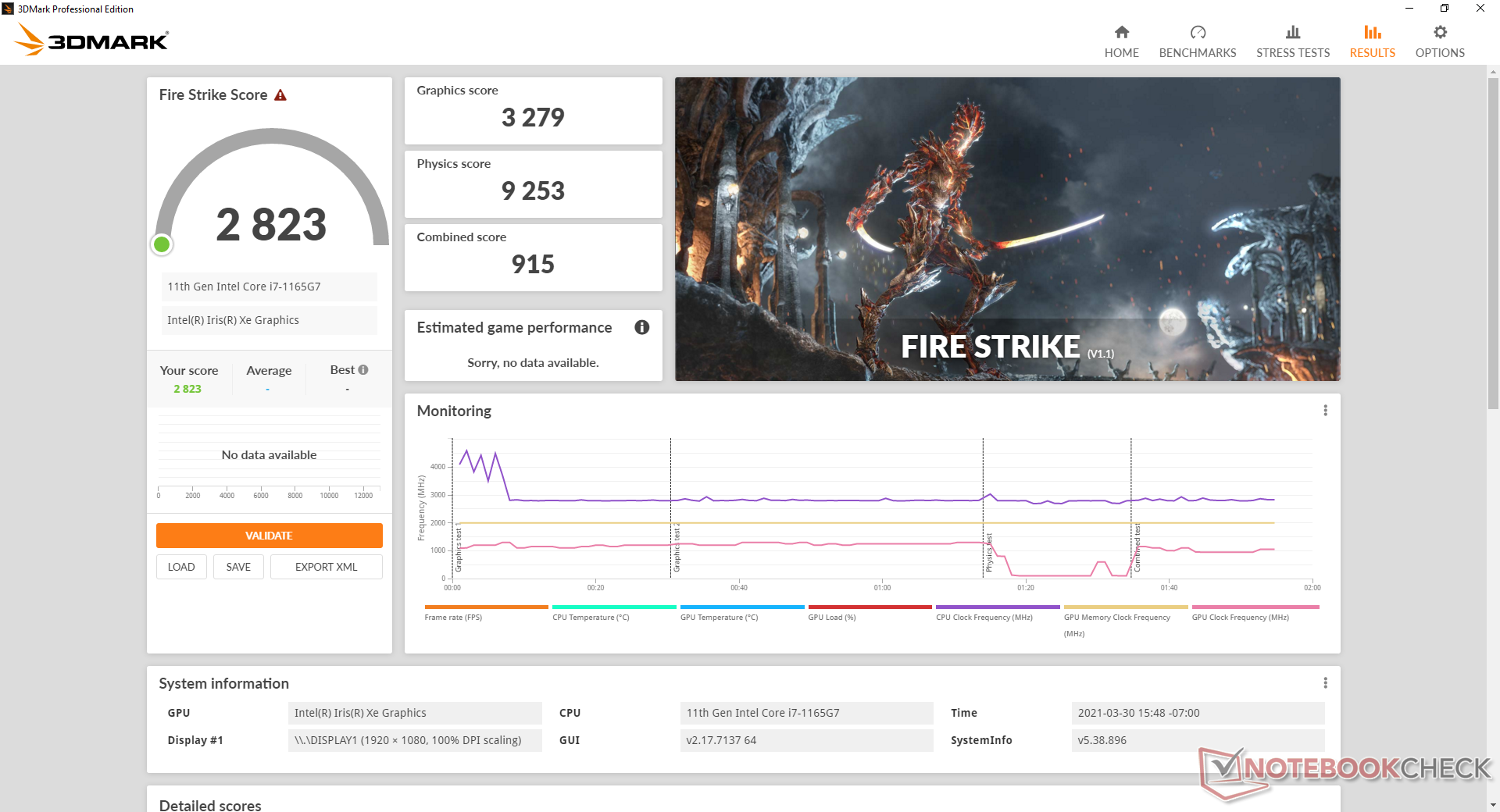 The relatively poor CPU performance can be observed when running Prime95. Clock rates would spike to 3.9 GHz for only the first few seconds until hitting a core temperature of 82 C. Thereafter, clock rates would drop and stabilize in the 1.8 to 1.9 GHz range in order to maintain a cooler core temperature of 63 C. Typical consumer laptops with the same Core i7-1165G7 CPU like the Dell XPS 13 or Razer Book 13 are able to sustain higher clock rates for faster processor performance.