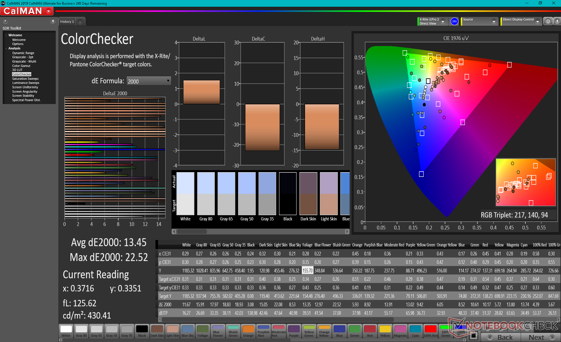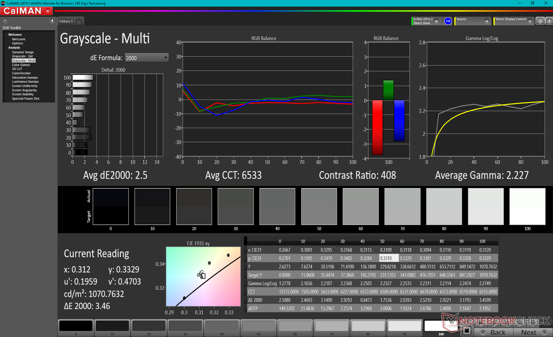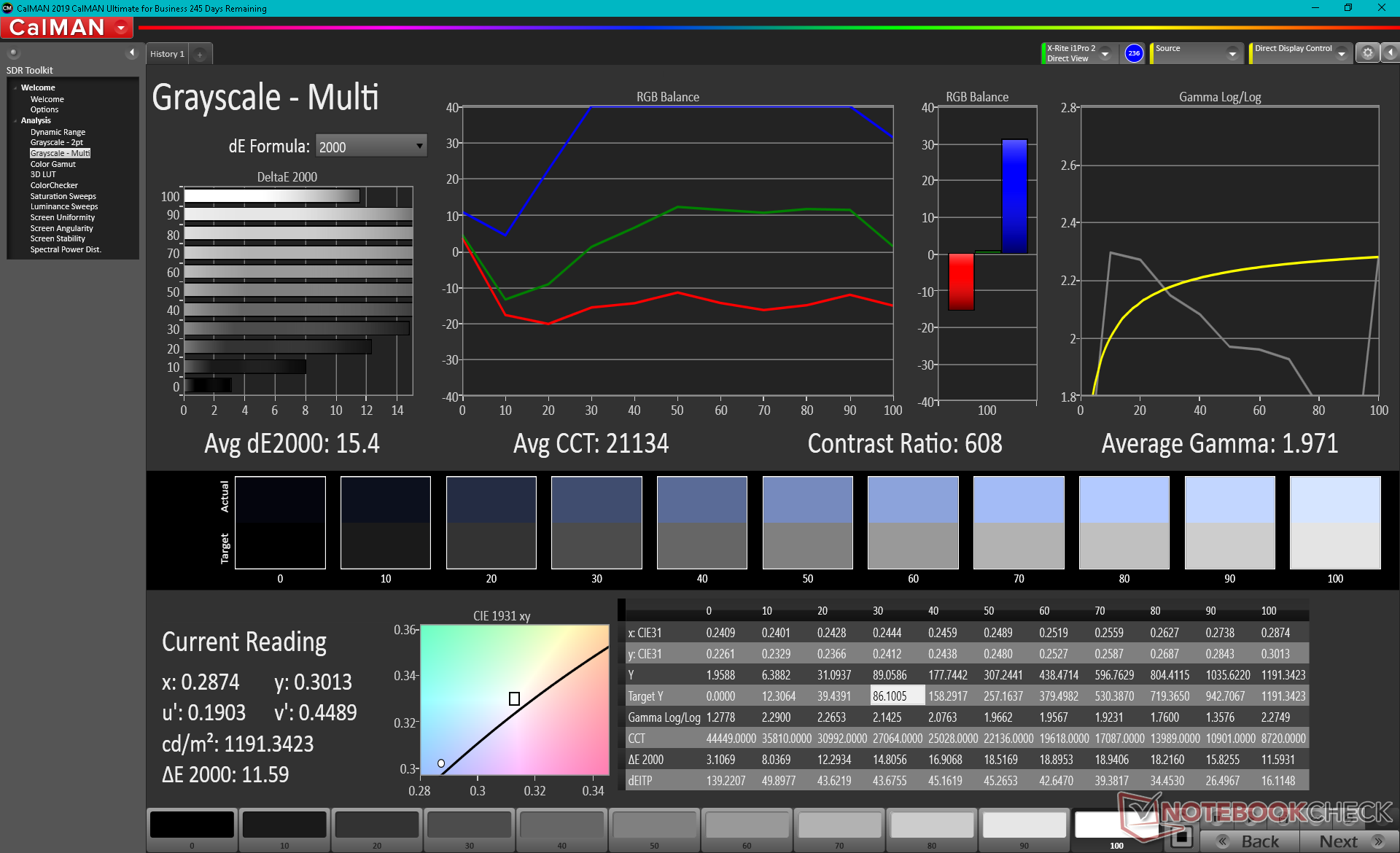 An X-Rite colorimeter analysis shows a very unbalanced display out of the box with an overly cool color temperature. Grayscale and colors improve dramatically once properly calibrated as shown by our screenshots below with average grayscale DeltaE values jumping from 15.4 to just 2.5. We recommend applying our ICC profile above to get the most out of the display.
